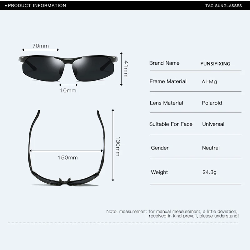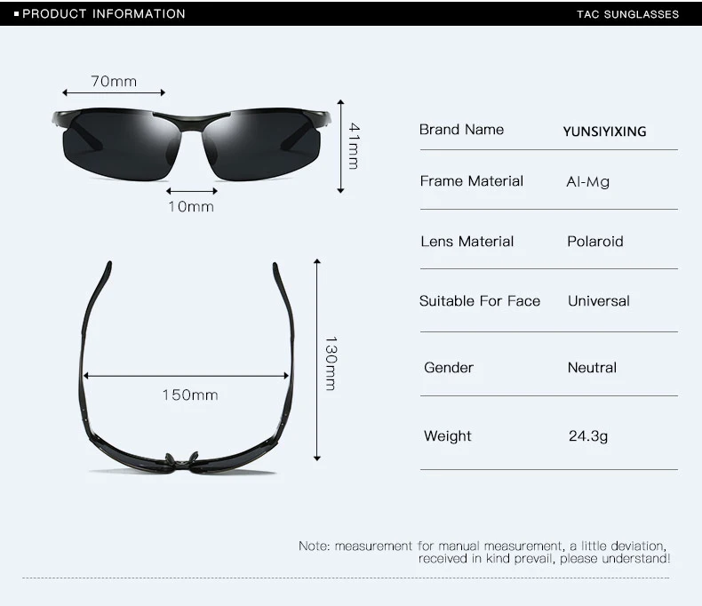 Детали производства Материал оправы: алюминий и магний Объектив: TAC Стиль: прямоугольник Костюм: унисекс Размер: 1. Высота линз: 41 мм 2. Переносица: 10 мм 3. Ширина линз: 70 мм 4. Длина дужек: 130 мм 5. Ширина оправы: 150 мм Примечание: измерение для ручного измерения, небольшое отклонение,