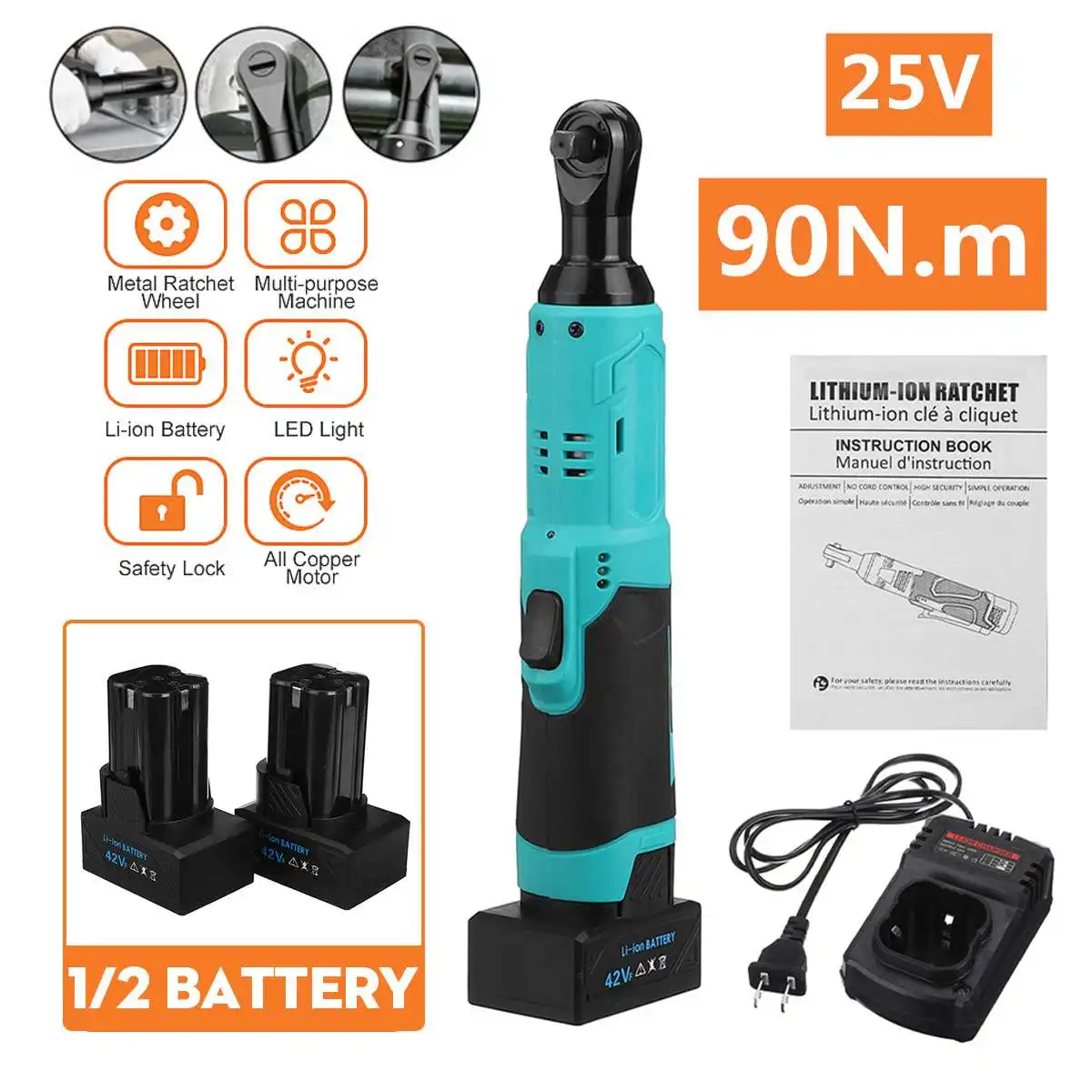 Электрический гаечный ключ, 25 в, 38 дюйма, беспроводной, с храповым механизмом, 90 Н м, угловой ключ для снятия винтовой гайки, инструмент для ремонта автомобилей и 2 аккумулятора