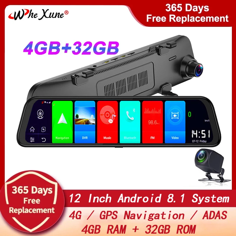 Видеорегистратор WHEXUNE автомобильный на зеркало заднего вида, 12 дюймов, 4 Гб + 32 ГБ, 4G, Android 8,1, GPS, ADAS, FHD, 1080P, Wi-Fi