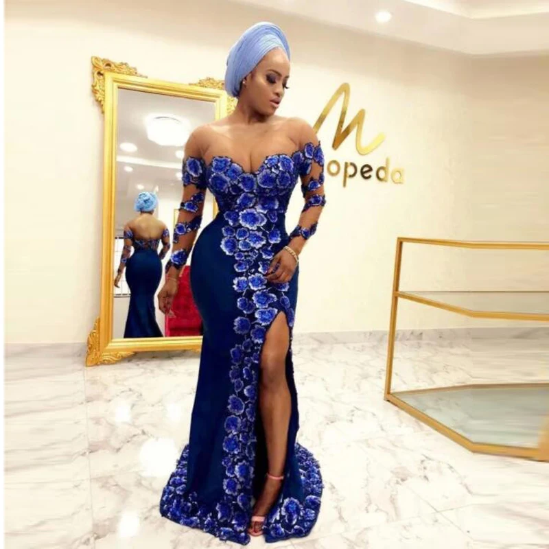 Африканские женские вечерние платья с длинным рукавом и юбкой-годе, Прозрачное платье с цветочной аппликацией и разрезом сбоку, платье для выпускного вечера Aso Ebi