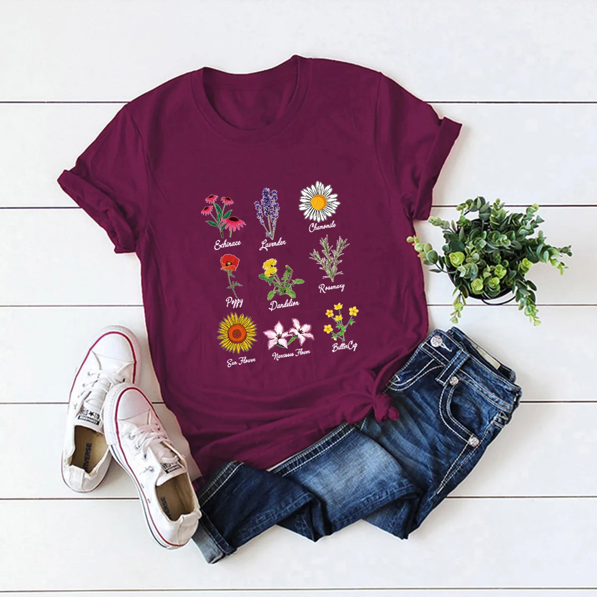 Женская футболка с коротким рукавом, круглым вырезом и цветочным принтом