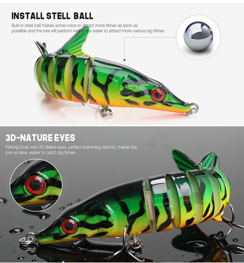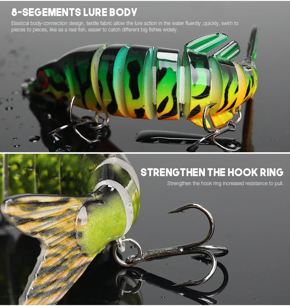 1) хорошо спланированные и: 3D жизни как рыбий глаз с 8-сегментов реалистичный составной корпус обеспечивает отличный внешний вид приманки для рыбалки. Части тела соединяются с текстильной пряжкой позволяет этой приманке вырываться из стороны в сторону, как настоящая рыба будет плавать.