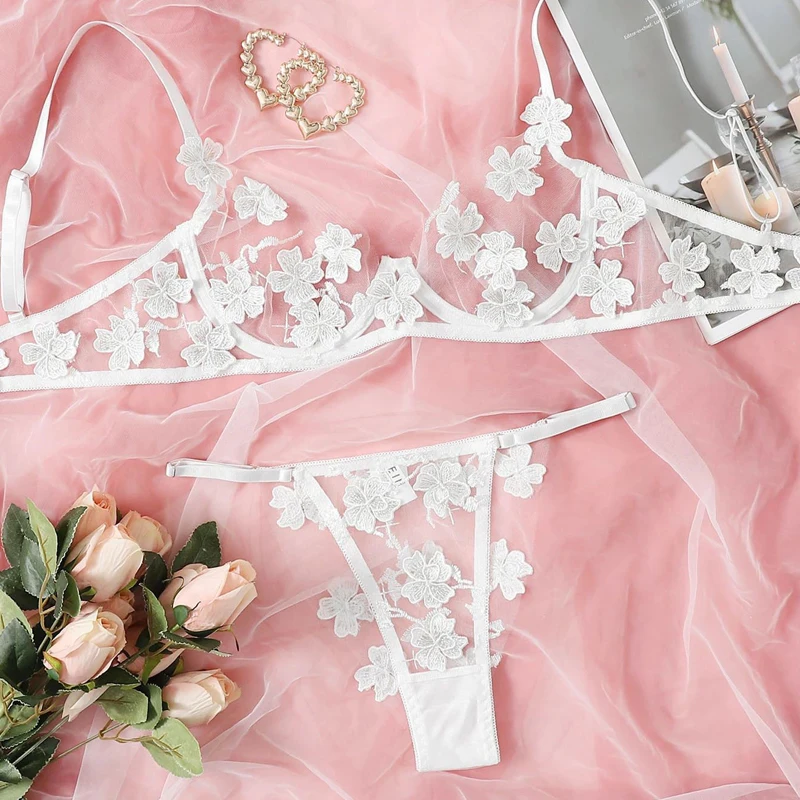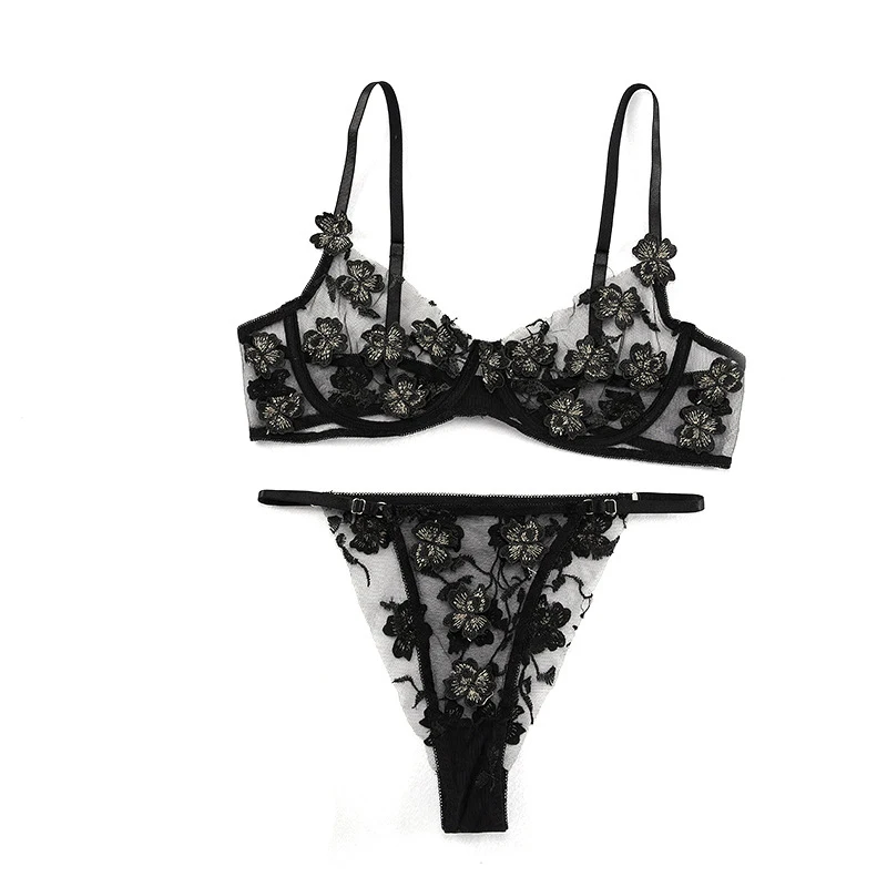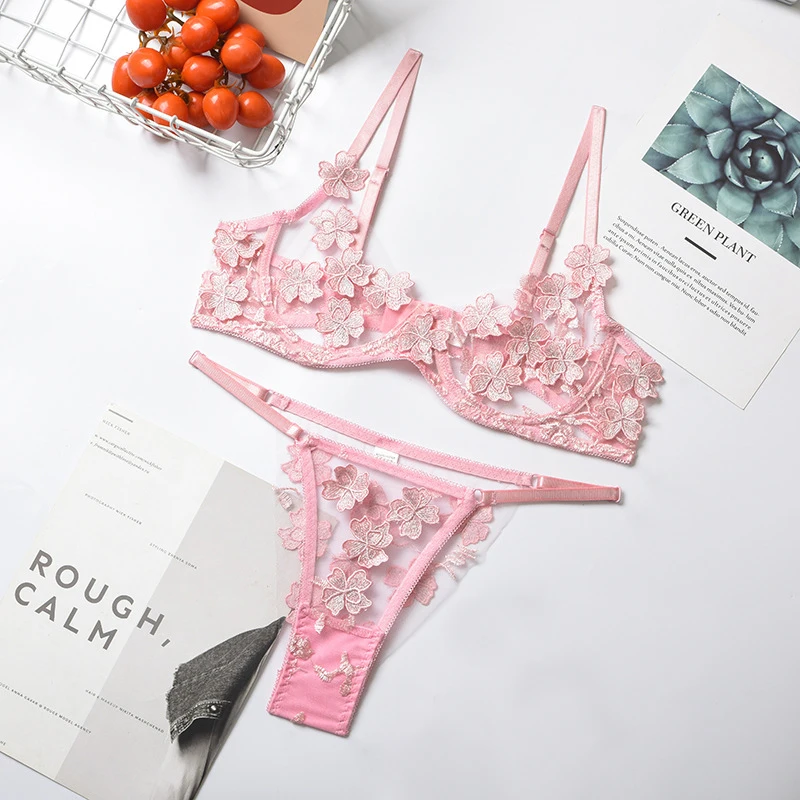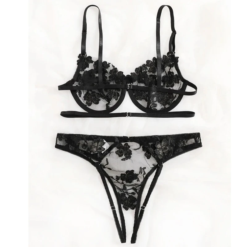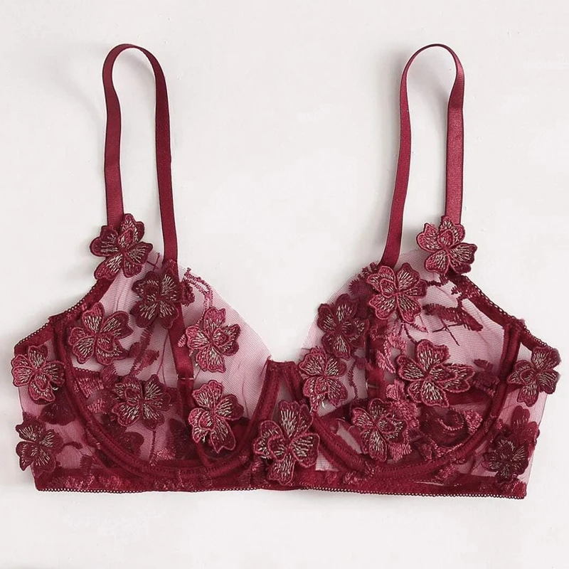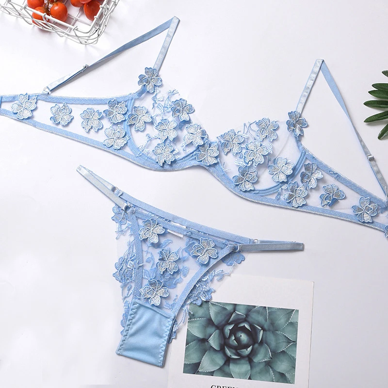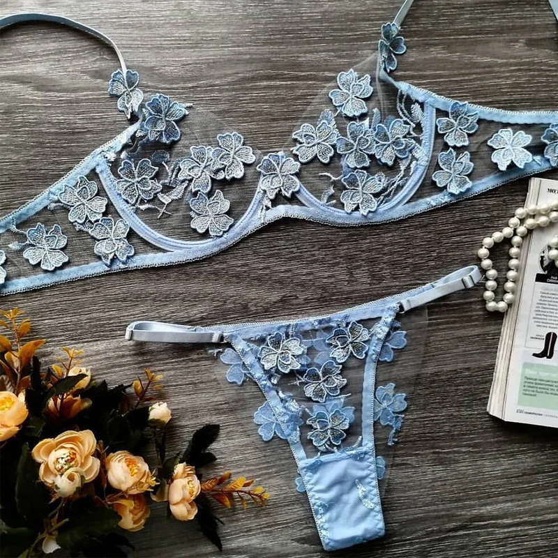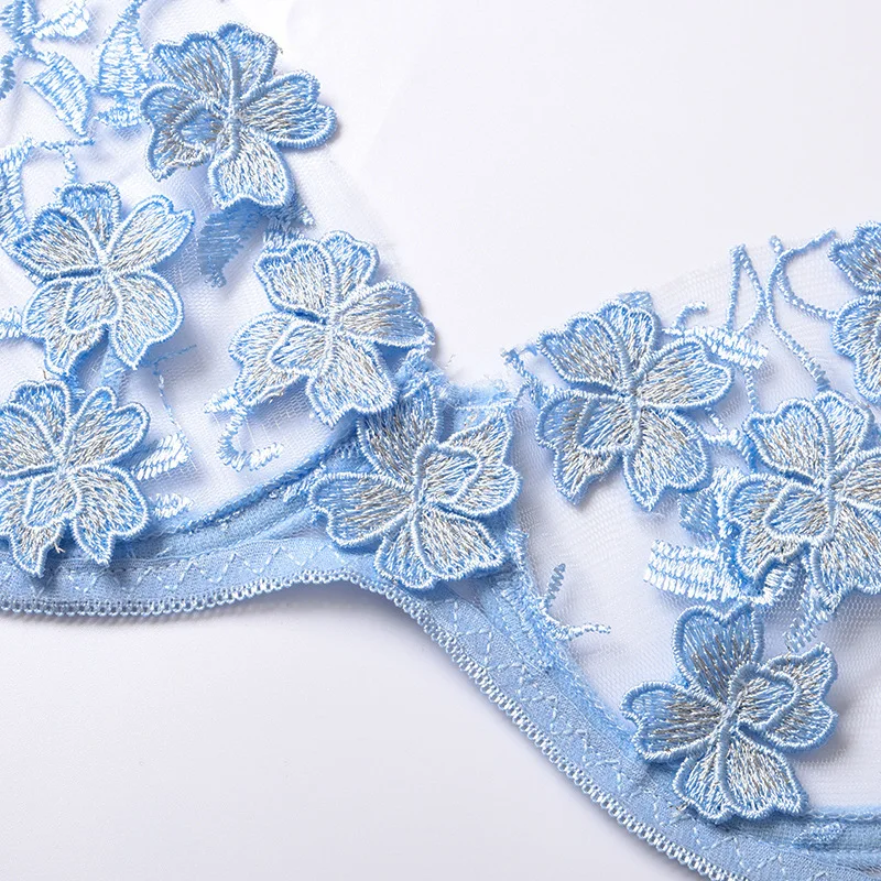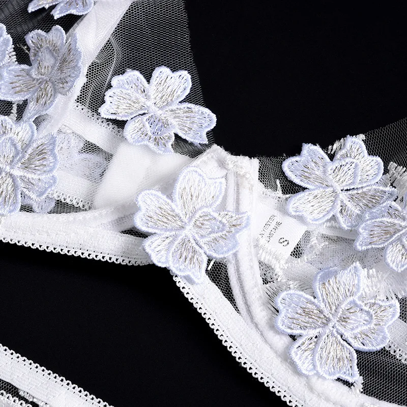 Комплект нижнего белья женский кружевной, прозрачный бюстгальтер с цветочной вышивкой, сетчатый Бралетт, с ажурными чашечками