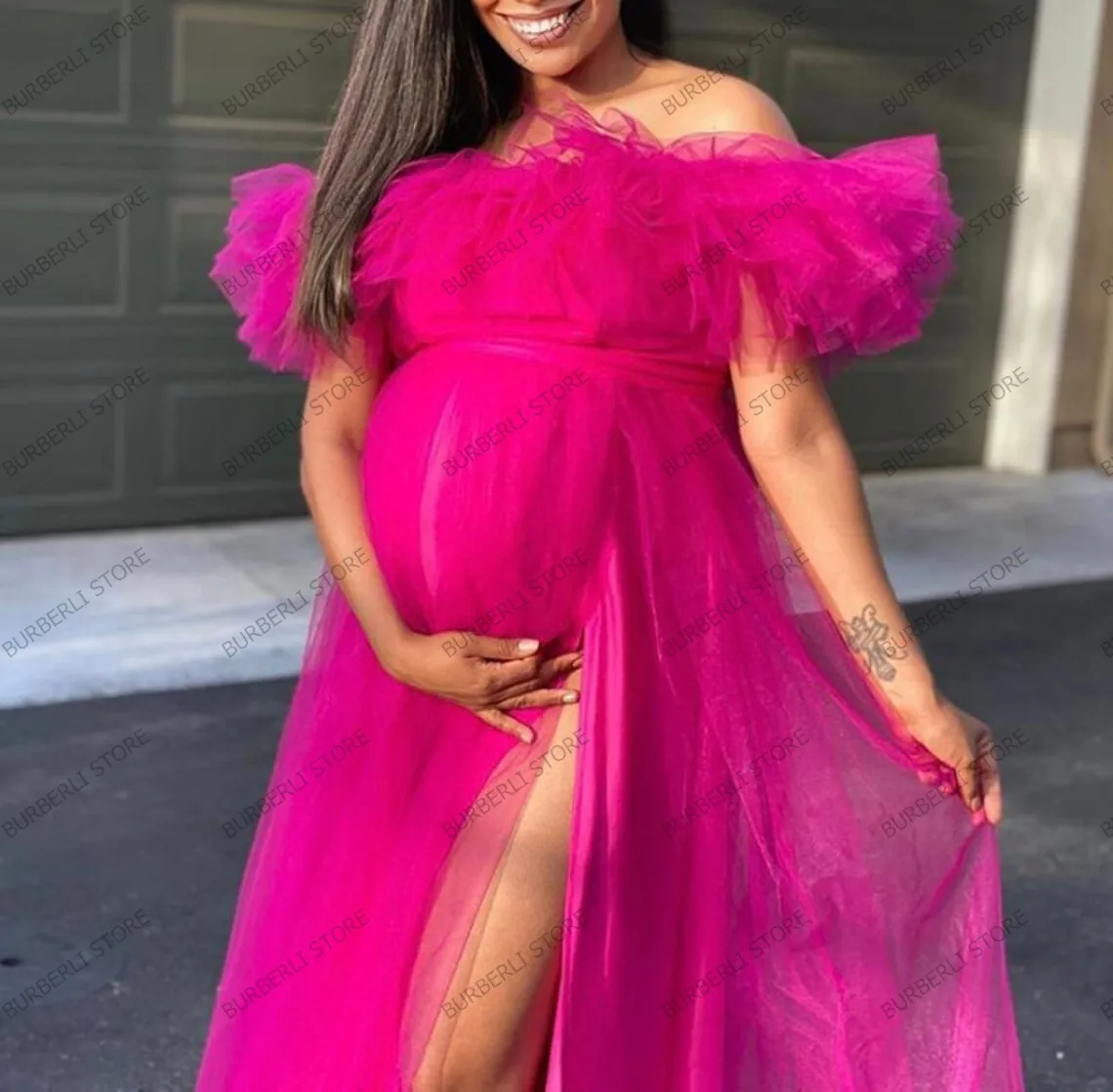 Женское Тюлевое платье с открытыми плечами, длинное розовое платье с разрезом сбоку и оборками, платье для невесты