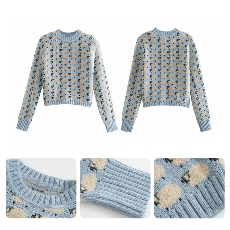 Для женщин с длинным рукавом свитер с круглым вырезом с изображением маленького с принтом "овечки" трикотаж укороченный топ F42F