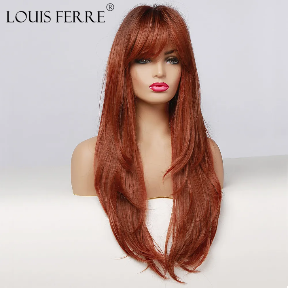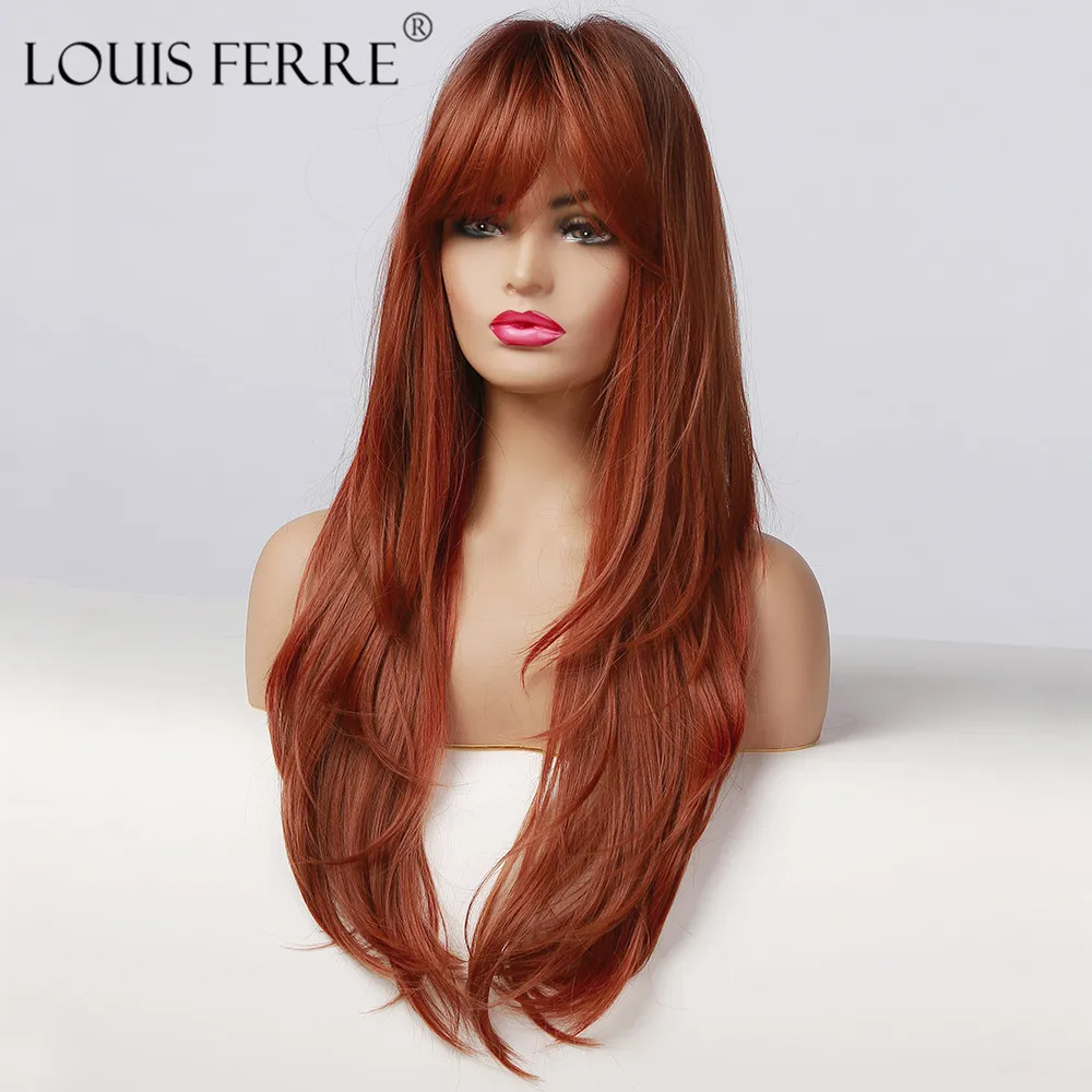 Женский красный коричневый парик LOUIS FERRE, темно-коричневые искусственные волосы, длинные пушистые вьющиеся Волнистые парики с челкой, жаропрочные искусственные волосы
