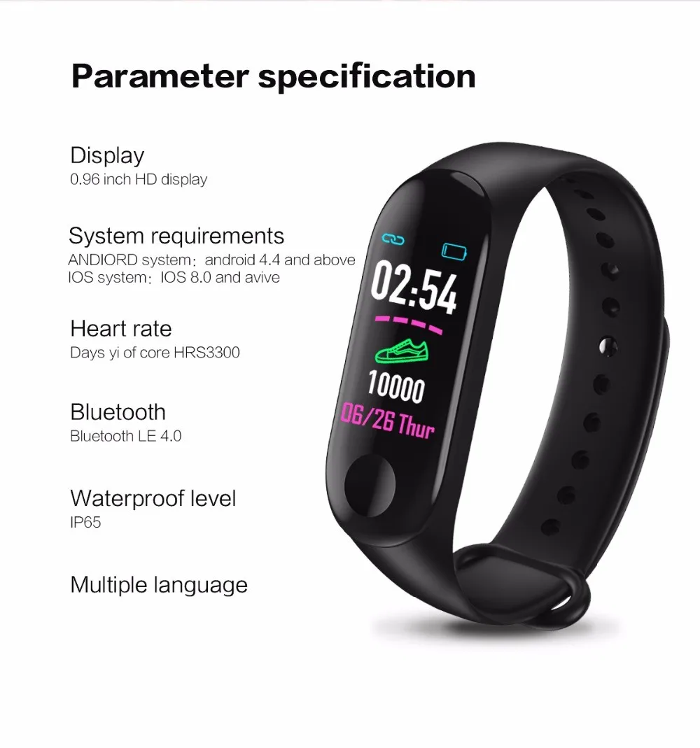 Умный Браслет M3 ОПИСАНИЕ:100% новый ярлык и высокое качество;Режим работы: сенсорное управлениеВключение питания: длинная клавиша функции нажатия -IP67 водонепроницаемый-Напряжение зарядки 5 в ток 1A-2.1A время зарядки 2 часа--Время работы в режиме ожидания 7-15 дней-Отслеживание активности в течение всего дня: шаги, сожженные калории, пробег и частота сердечных сокращений.-Умные напоминания: напоминания о звонках, push-сообщения, напоминание о малоподвижности.-Больше функций: Поиск телефона, Удаленная съемка камеры.-Непрерывный монитор сердечного ритма: Непрерывное автоматическое отслеживание сердечного ритма прямо на запястье в секунду.-0,96 "TFT цветной сенсорный экран: HD экран, легко читать все фитнес-данные.-Настраиваемые Циферблаты часов-Bluetooth 4,0, совместим с системой Android 4,4 и выше, ios 8,0 и выше.-Язык поддержки браслета: английский, русский, немецкий, французский, упрощенный китайский, традиционный китайский, португальский, испанский.-Язык поддержки приложения: английский, русский, немецкий, французский, упрощенный китайский, традиционный китайский, португальский, испанский, голландский. Посылка включает в себя:1 * умный Браслет1 * Руководство пользователя Примечание: Это не Xiao Mi Band 3. Смарт-браслет не предназначен для медицинского использования, пожалуйста, не покупайте для проверки здоровья (проблемы с сердцем, проблемы с кровяным давлением) Это не для профессионального использования. Просто может быть справочной информацией.
