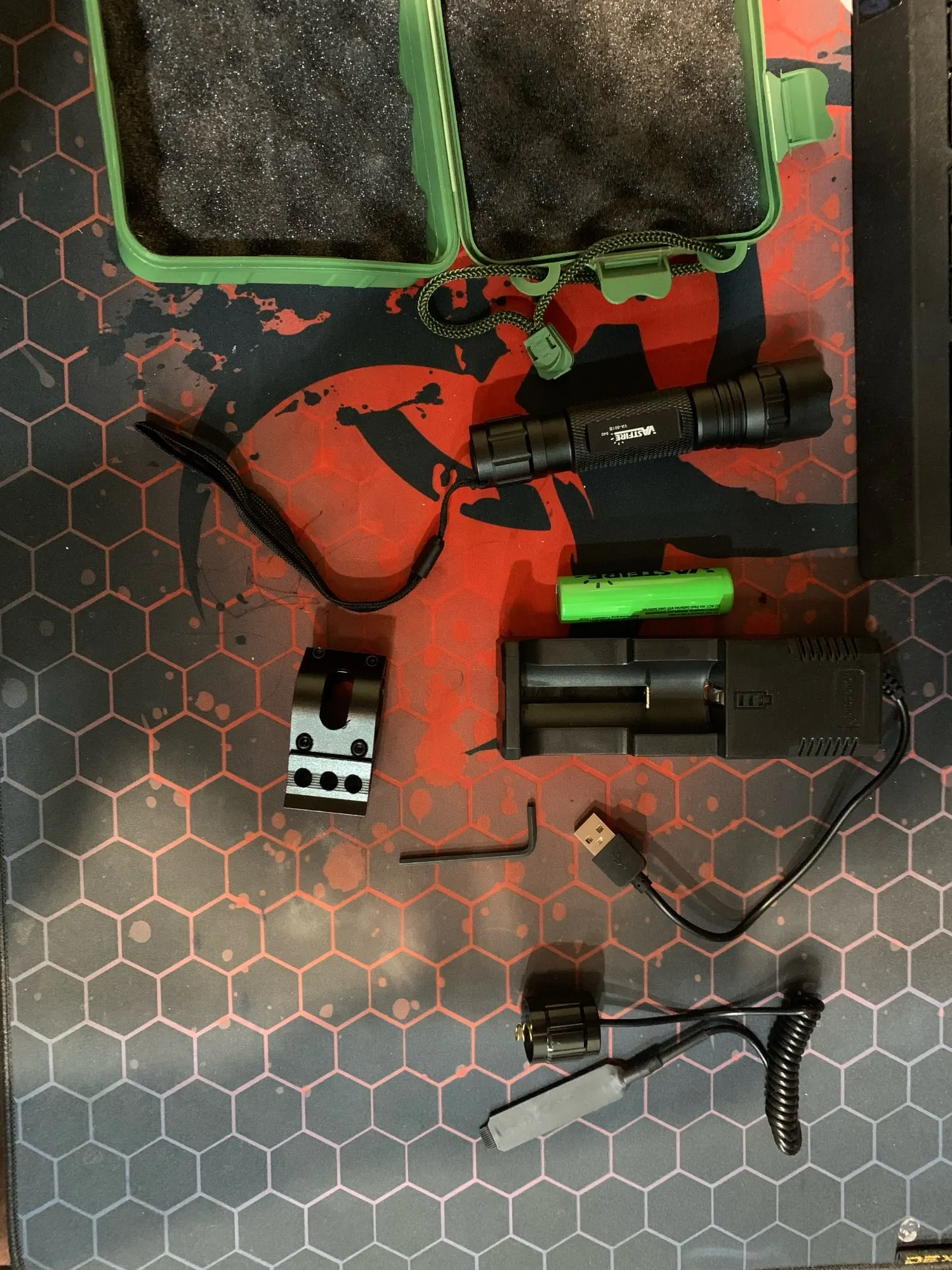 Товар соответствует описанию. Доставка очень быстрая. Фонарь сделан хорошо, нигде ничего не болтается, аккумулятор, выносная кнопка и usb зарядка в комплекте. крепление как заказывал. Фонарик работает. С ПНВ не проверял, проверю дополню отзыв.