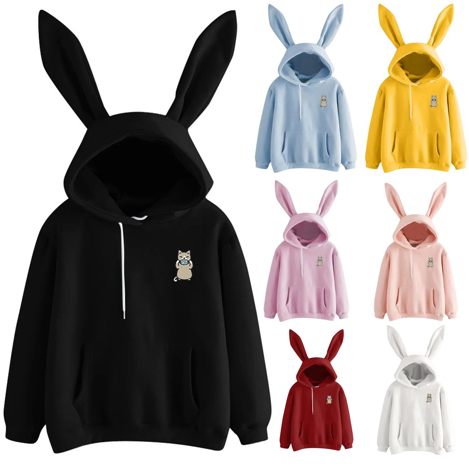 Женская Повседневная Толстовка с капюшоном 40 #, однотонный пуловер с длинным рукавом и капюшоном в виде кота с кроличьими ушками, Топ для женщин