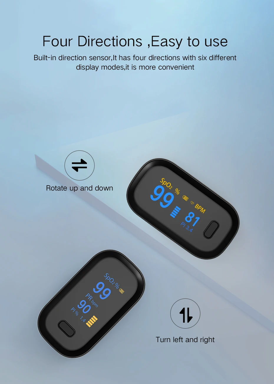 1. Качественный oled-дисплей. 4 направления для чтения.2. Параметры: SPO2 (насыщение кислородом пульса), PR (Частота пульса),PI (индекс перфузии)3. Вес, портативный и простой светильник.4. Точное считывание, несколько секунд для получения данных.5. Автоматическое выключение в течение 8 секунд, когда нет сигнала.6. Подходит для занятий спортом на открытом воздухе, альпинизма, долгих рабочих часов и домашнего здоровья семьи7. Подходит для пожилых людей, людей с проблемами дыхания или людей, которые часто любят спорт.