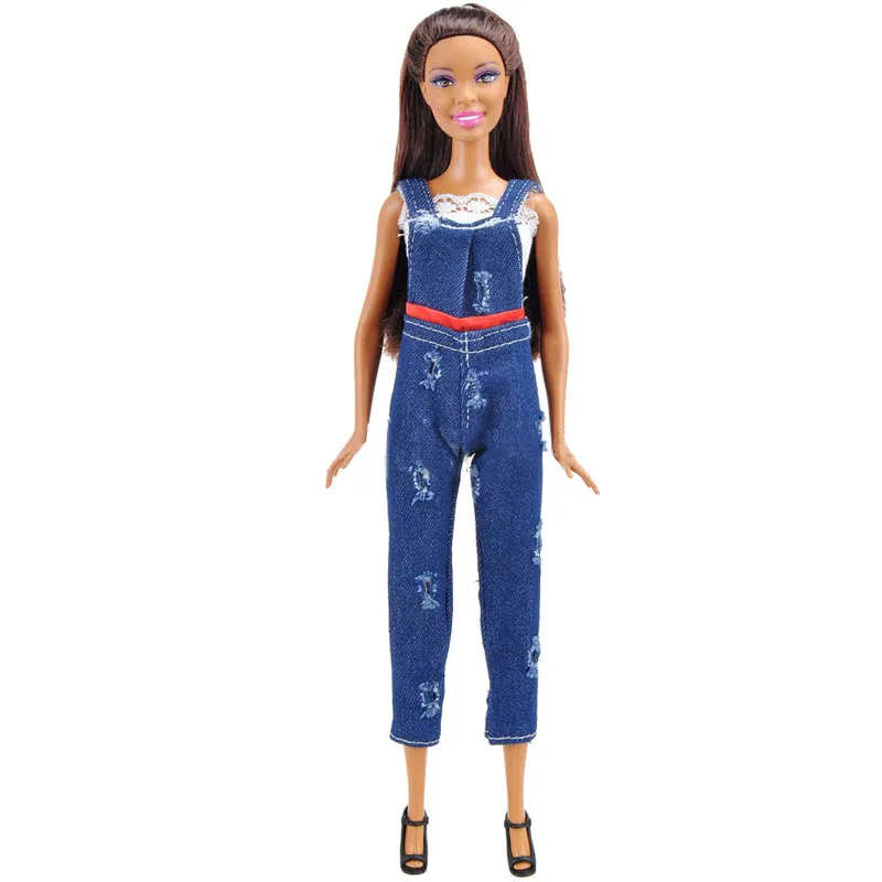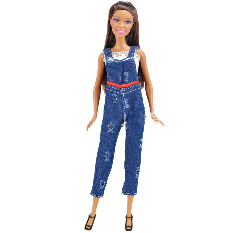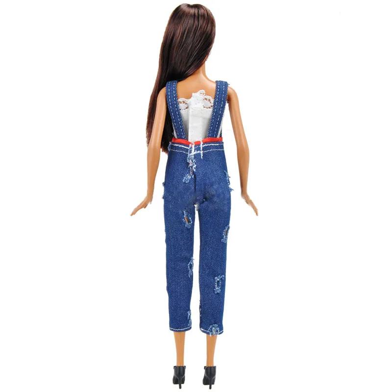 Модные наряды для кукол Барби 16, белый кружевной короткий топ и джинсовые штаны, подтяжки, одежда ручной работы для кукольного домика Барби