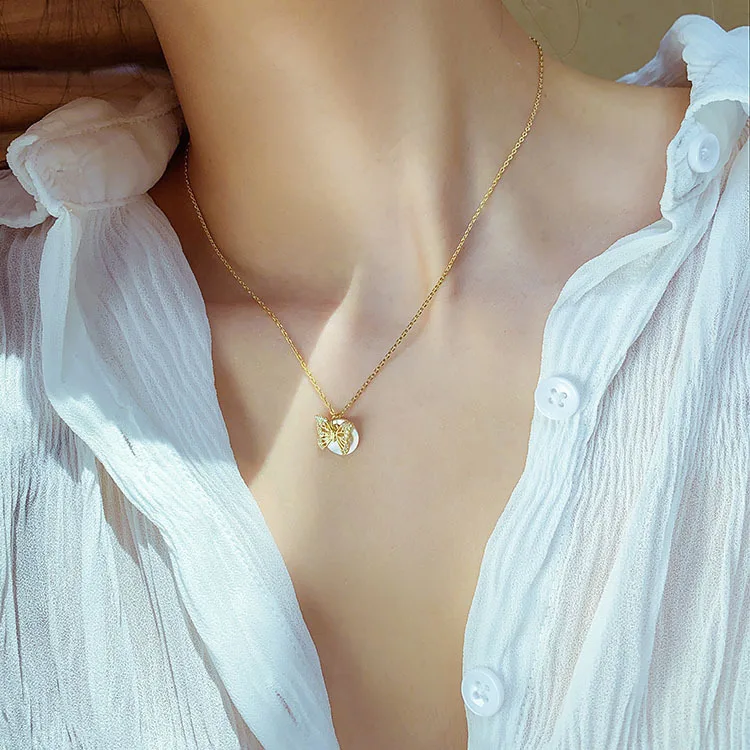 Женское золотистое ожерелье из титановой стали с гальваническим покрытием, простое ожерелье с бабочкой из циркония, ожерелье с бамбуковым кулоном, ювелирное изделие в подарок