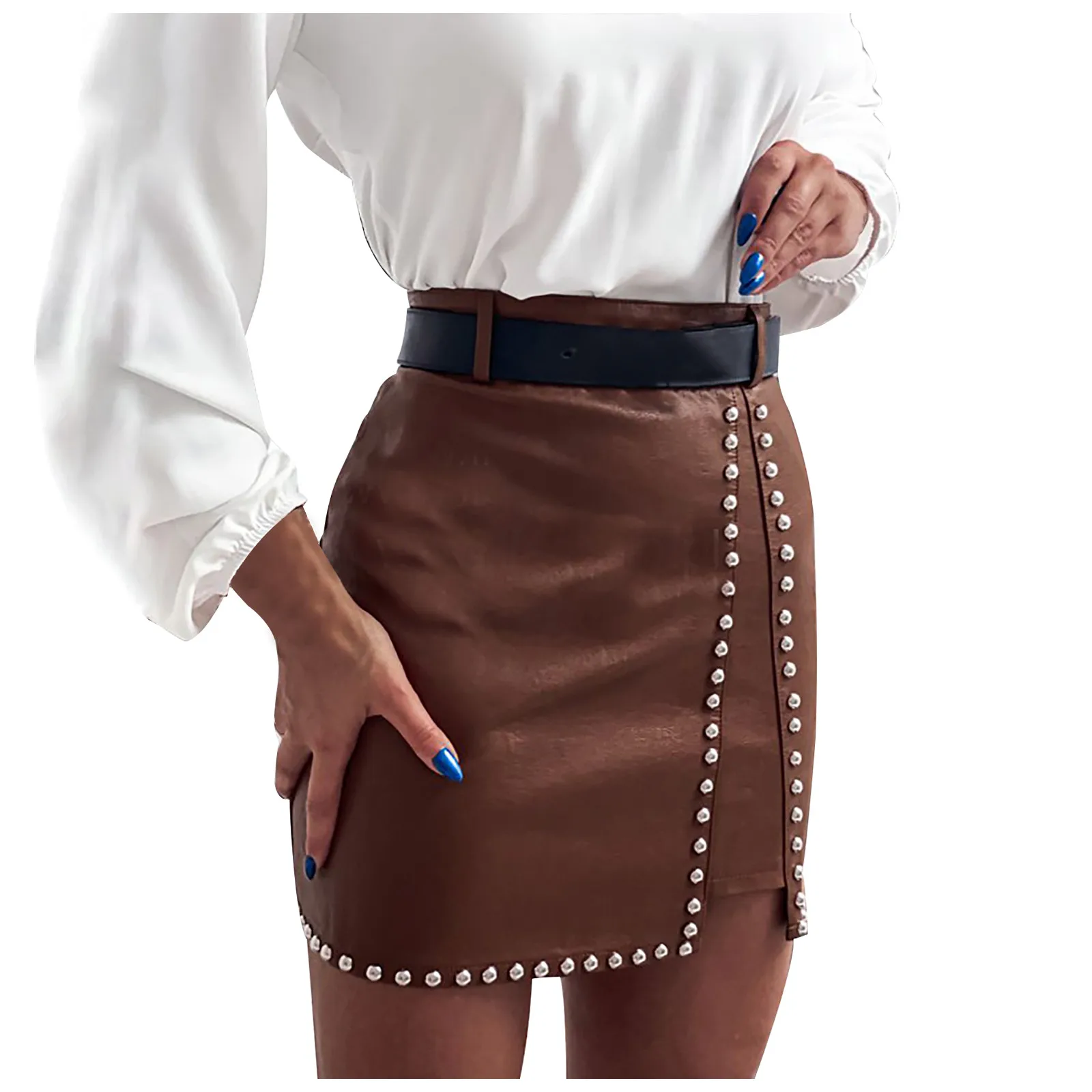 Модная женская пикантная кожаная юбка с завышенной талией, Женские однотонные юбки мини с разрезом и бусинами, локомотивная уличная одежда