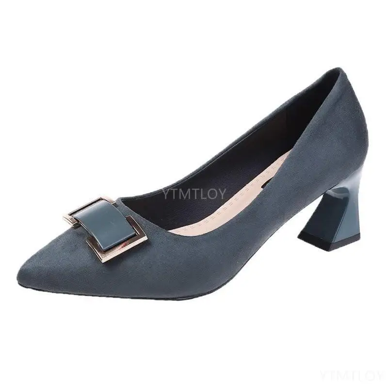 Туфли-лодочки женские из лакированной кожи, с острым носком, на толстом металлическом каблуке, синие, Осенние, 2021