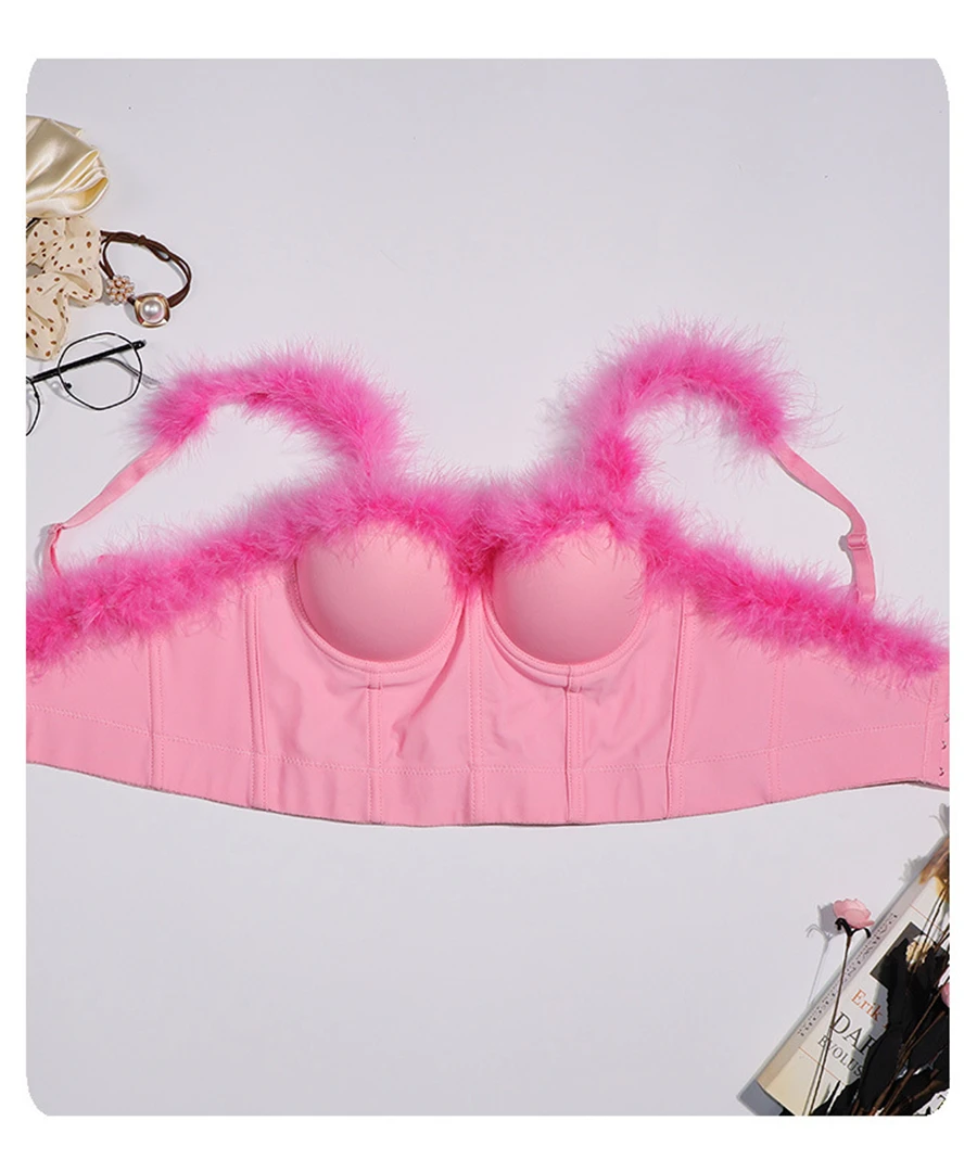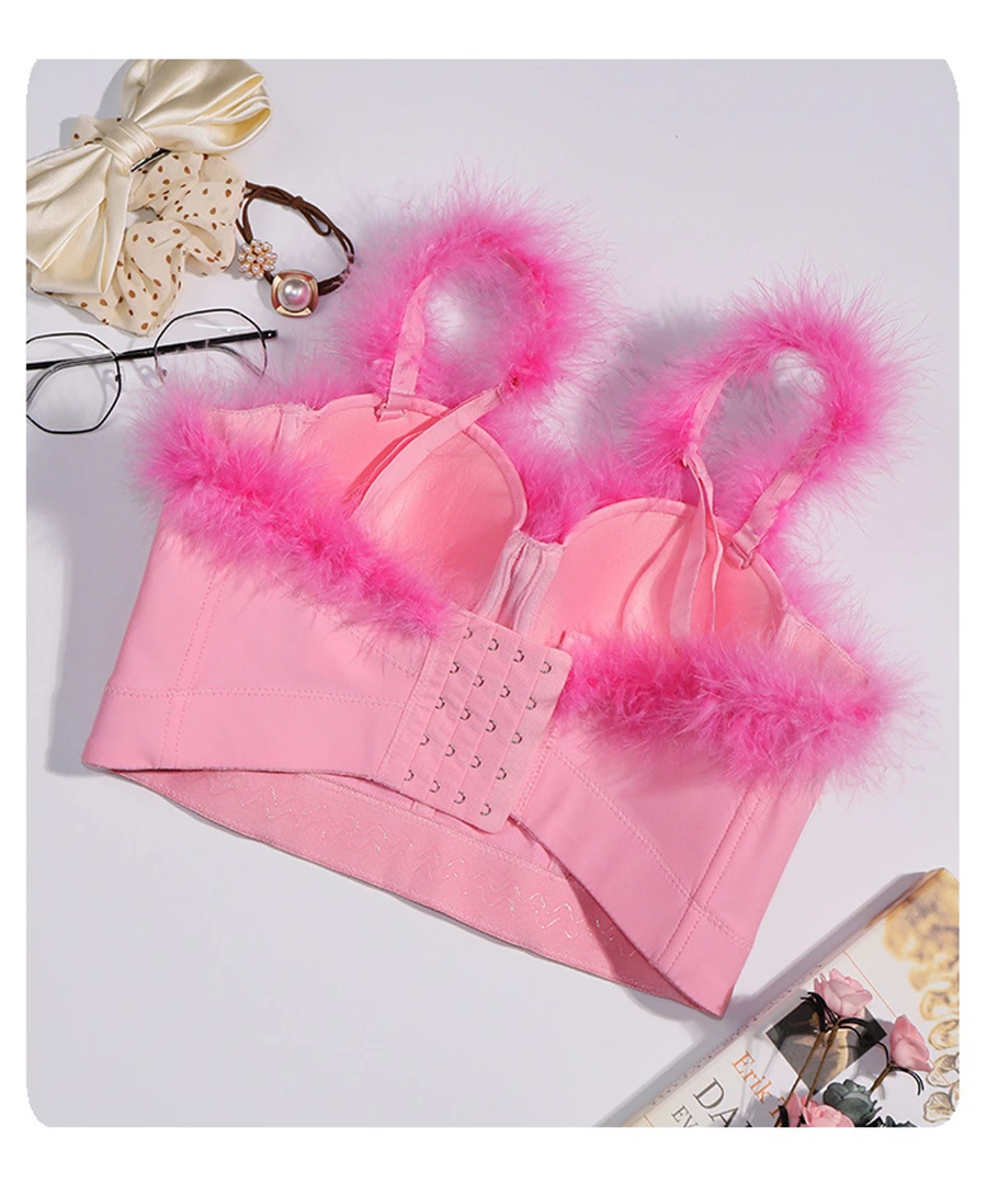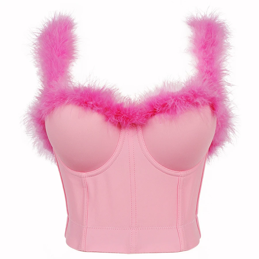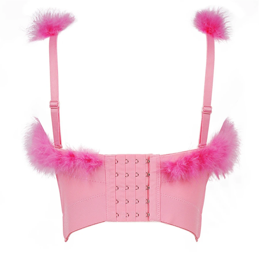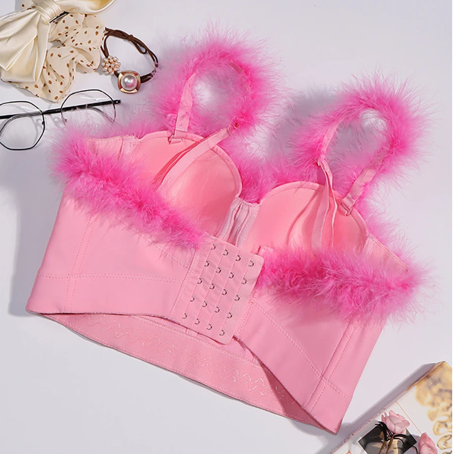 Женский укороченный топ с пуш-ап, розовый топ из искусственного меха со встроенным бюстгальтером с открытыми плечами, женская одежда, зима 2021