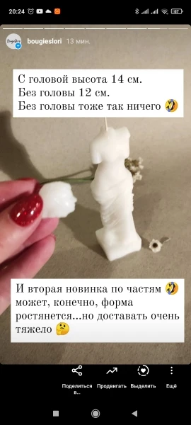 Форма слишком мягкая, голову достать не оторвав нереально, я попробовала разрезать форму и теперь ее в мусорку, потому что форма вся расползается и воск вытекает , резинками скрепить никак, потому что они ее пережимают , когда заливаете воск нужно ставить форму во что-то, потому что самостоятельно она не стоит, а наклоняется во все стороны , вообщем я разочарована, деньги в пустую