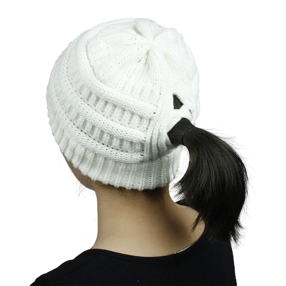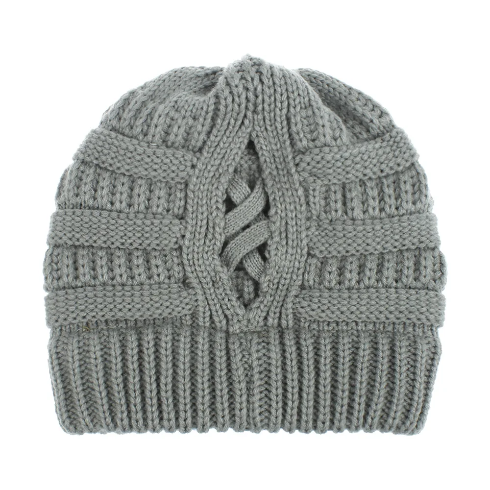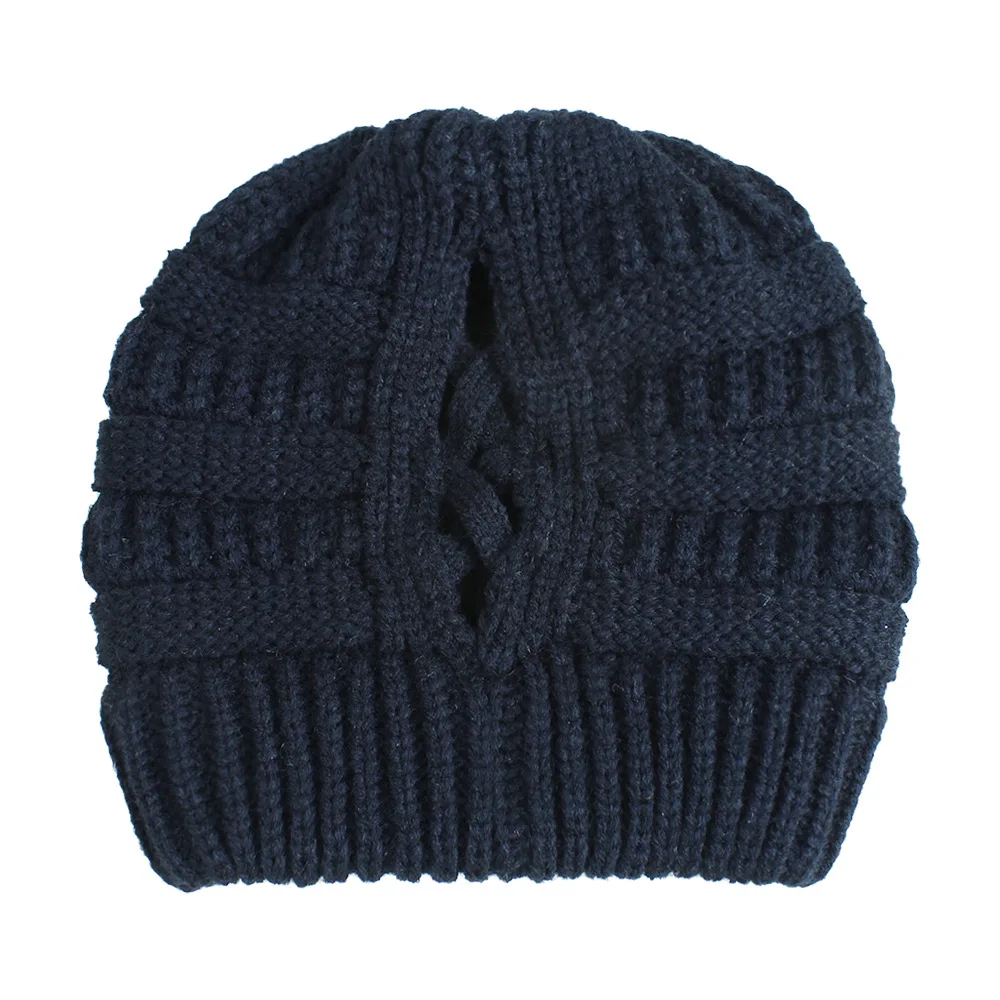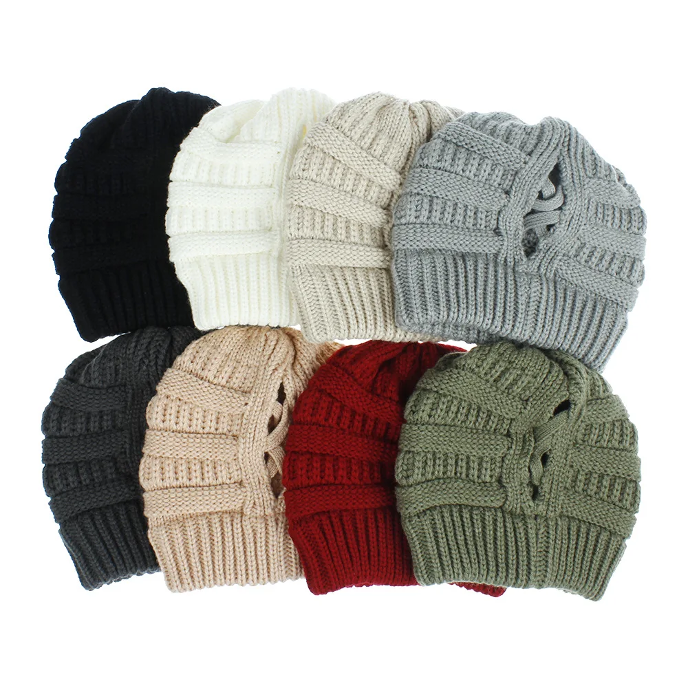 Для женщин Шапка-бини шапка с отверстием для хвоста грязный булочка BeanieTail грязный Высокая булочка крест-накрест отверстие Мягкий эластичного хлопкового трикотажа череп Кепки