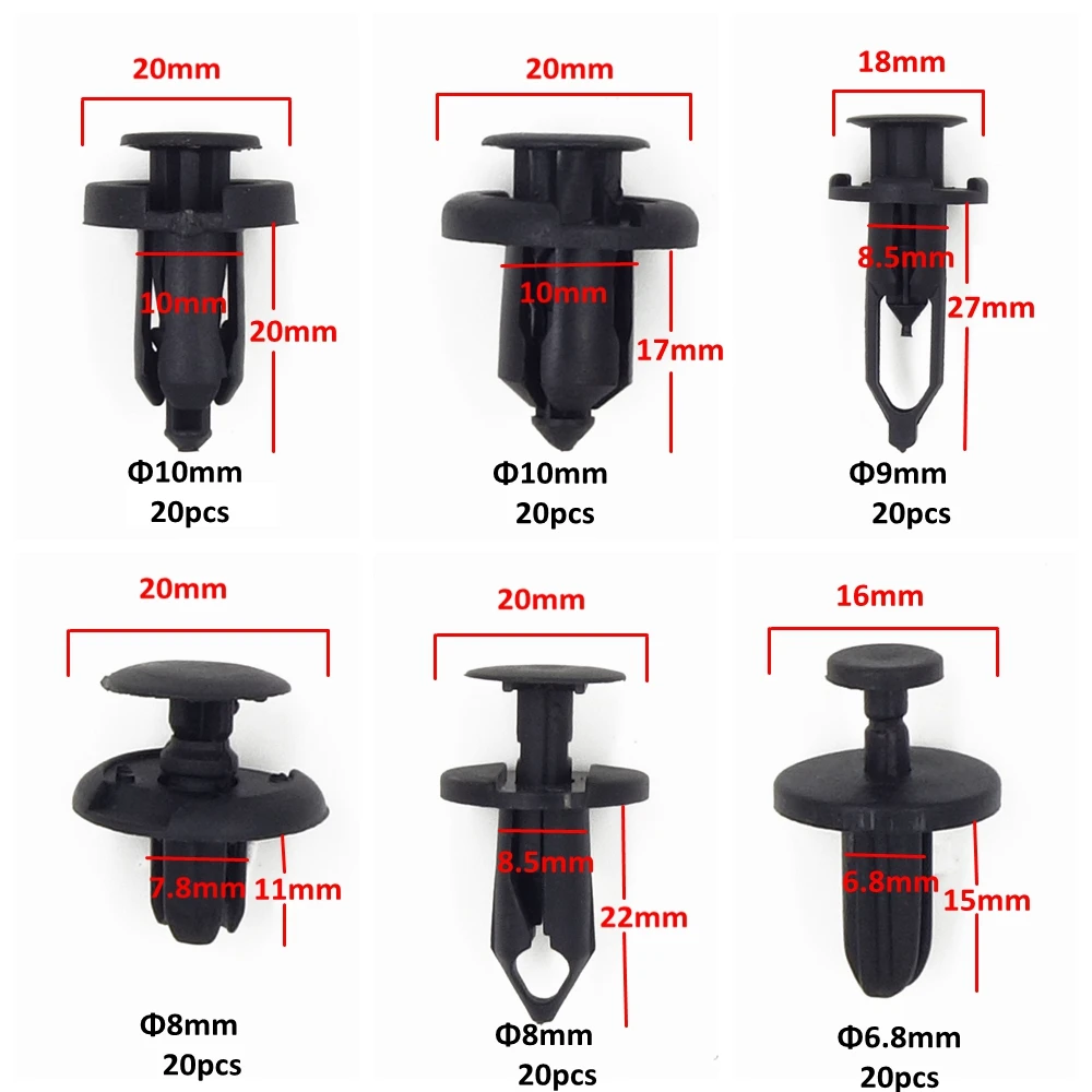 1. Шесть различных моделей нажимных пластиковых зажимов подойдут для большинства автозапчастей, крепко удерживают ваши детали.2. Изготовлен из высококачественного черного нейлонового материала, не изнашивается и не подвержен коррозии, не сломается и не трескается во время использования.3. Широко используется для отделки дверей, хомута, крыла, бампера, боковой юбки, решетки, крышки двигателя и защиты от брызг.