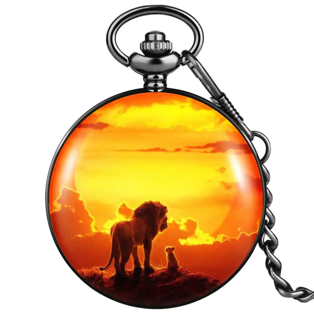 Модный внешний вид: классические черные карманные часы с изысканным рисунком льва, практичные и полные индивидуальности.