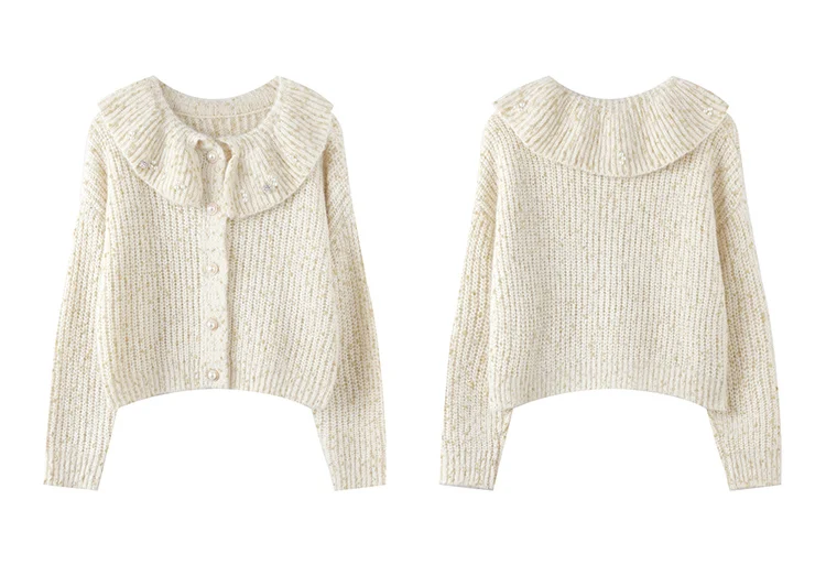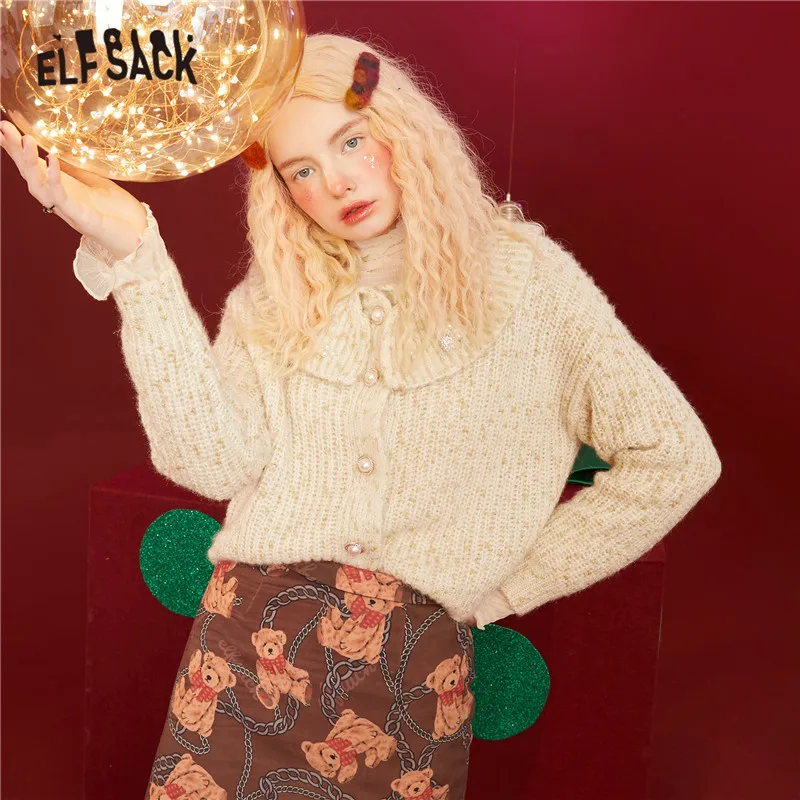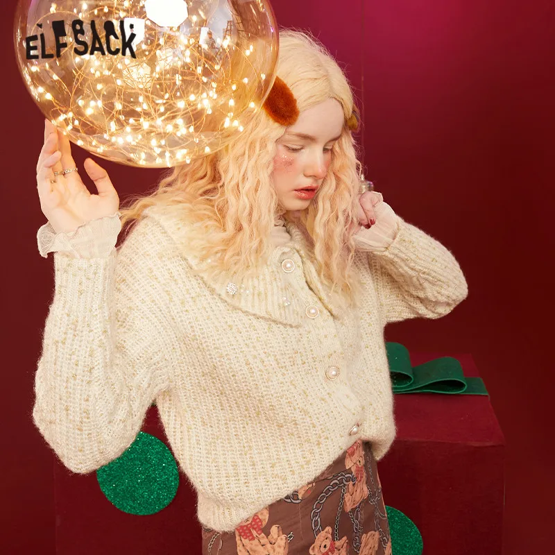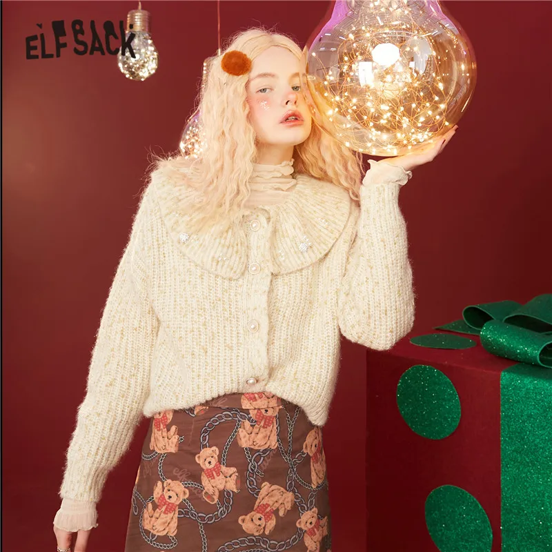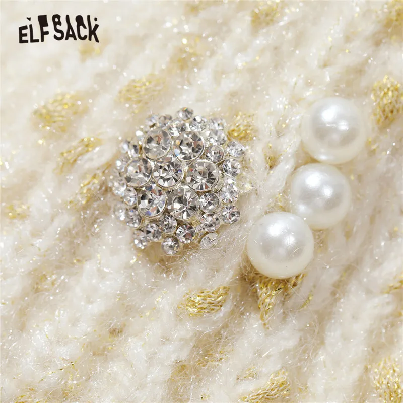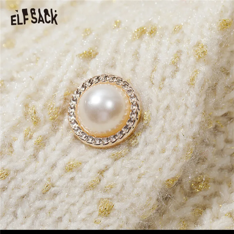 Женский кардиган ELFSACK, однотонный кардиган на пуговицах с жемчугом, 2021, зимний винтажный Мягкий Топ с бриллиантами
