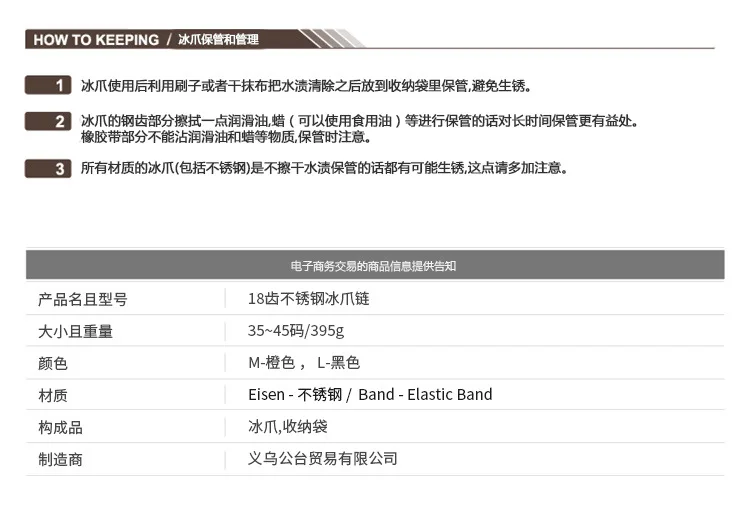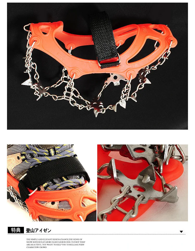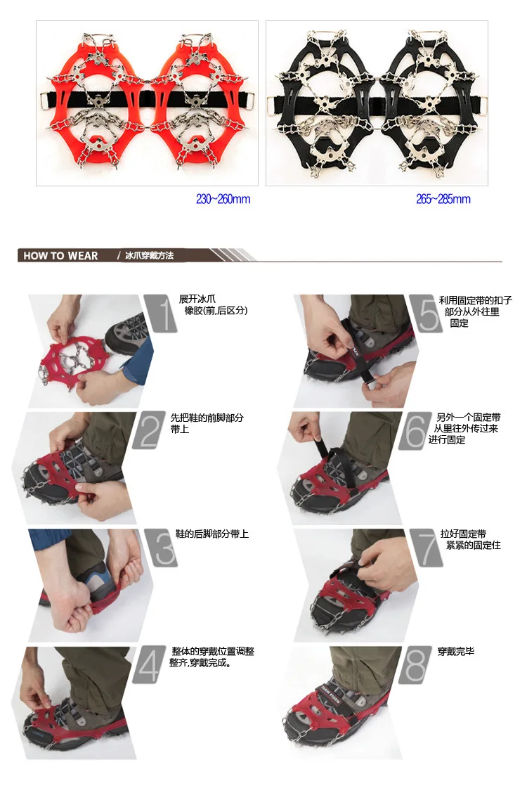 Особенности: С 18 высокопрочными стальными зубьями для агрессивной тяги, 6 крошечных стальных зубцов для нескольжения. Стратегическое размещение шипов обеспечивает равное распределение веса для длительного комфорта и долговечности. Прочный эластичный ремень обеспечивает плотное удержание обуви даже при холодных температурах. С крепежной лентой для вас, чтобы носить более надежно. Сумка для переноски входит в комплект для хранения ваших косточек. Сотрудничайте со всеми видами спортивной обуви, походной обуви и горных ботинок и т. д.