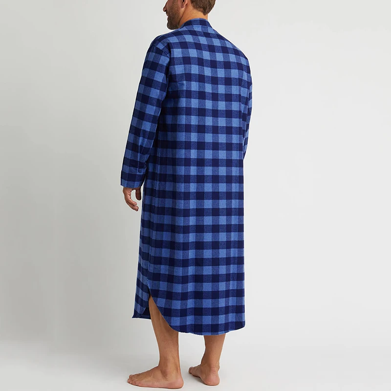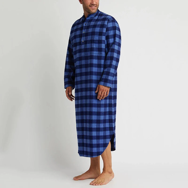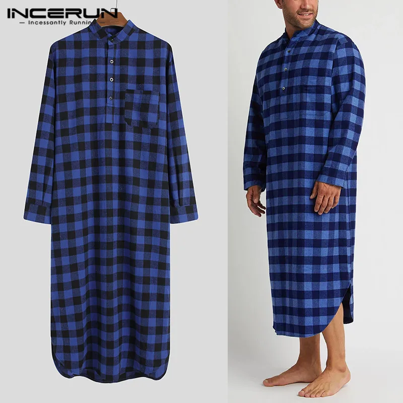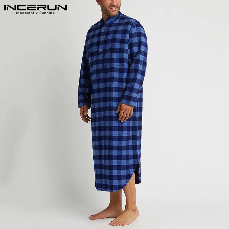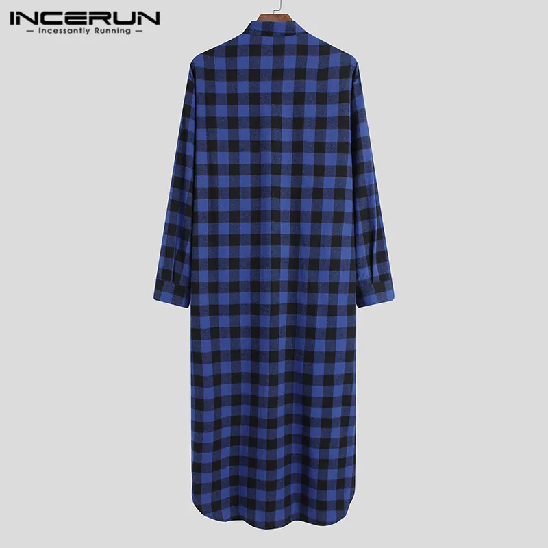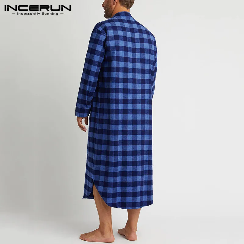 Модные рубашки с длинным рукавом и стоячим воротником ночная рубашка INCERUN мужские клетчатые сна халаты мужские свободного кроя на пуговицах, одежда для сна, повседневная решетки пижамы S-5XL