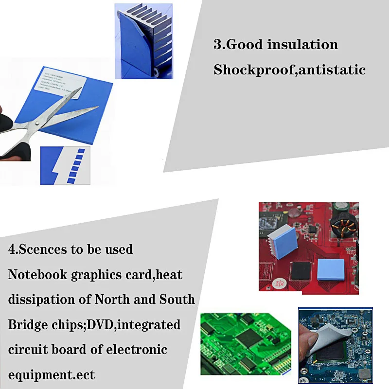 Коврик имеет липкость, хорошую проводимость, вы можете легко положить его на IC и радиатор, вы можете поместить его на светодиодный IC SMD DIP или другие.