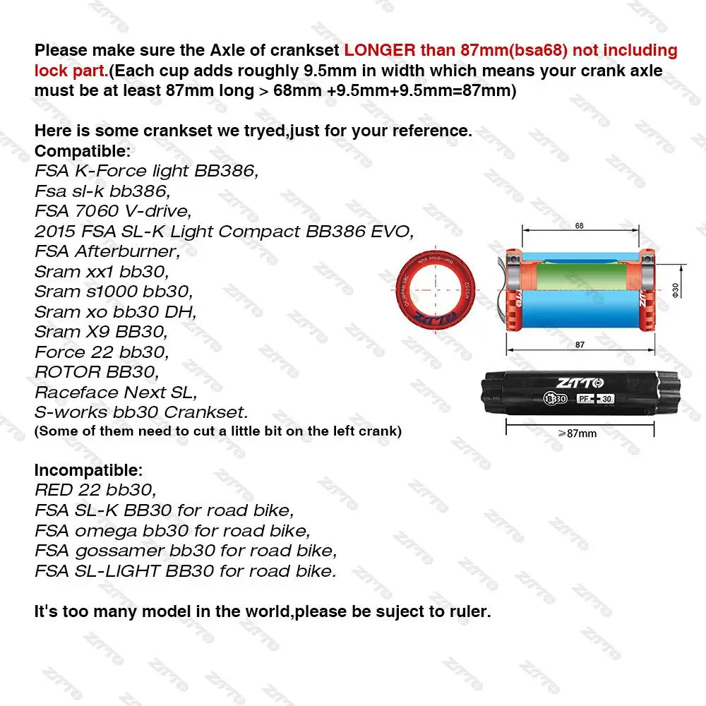 Нижние кронштейны ZTTO BB30sh, керамический адаптер BB30, 24 мм, дл...