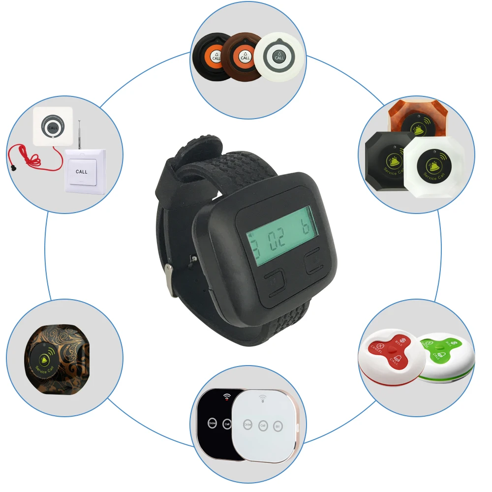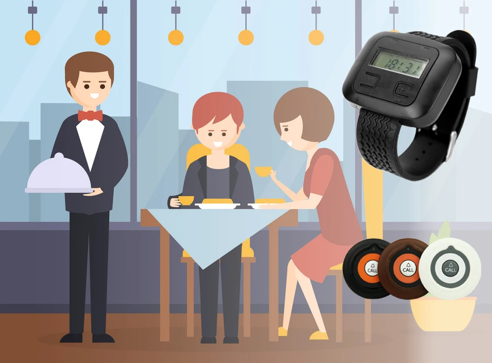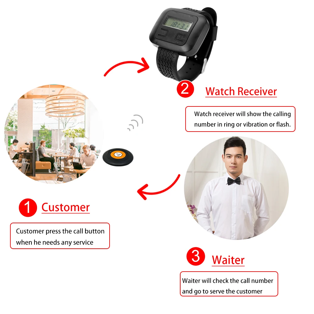Во-первых, кнопки вызова вставляются или ставятся на стену или на стол, когда у гостей есть какие-либо услуги, он или она нажимает кнопки вызова, приемник (светодиодный экран или пейджер часов) получите сигнал с вибрацией или звуком, показывая номер таблицы, Тогда официант будет знать, какой стол будет подан.