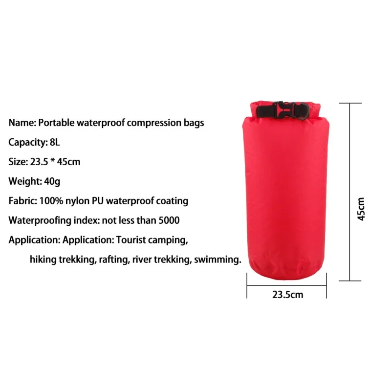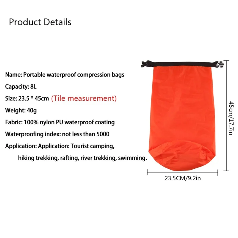 Особенности:1. Подходит для быстрого погружения2. Мягкий и гибкий для удобного хранения3. Многофункциональное приложение для хранения4. Усиленная строчка на всех точках стресса5. Прочный, протирать и легко хранить6. Защищает ваши ценные вещи от грязи, пыли, песка и воды7. Изготовлен из высококачественной водонепроницаемой ткани и полностью герметичный шов8. Сворачивающаяся застежка закрывает влагу и делает сумку герметичной9. Гуманизированный дизайн, его можно использовать в качестве спасательного ремня в чрезвычайных ситуациях10. Можно положить еду, одежду, бумажник и другие личные вещи11. Может быть сжато, удобно носить с собой.Характеристики:Материал: полиэфирная тафта 190TЦвет: небесно-голубой, синий, красный, Оранж, зеленый, фиолетовыйЕмкость: 8 лТема: СпортПодходит для: плавания, пляжа, каякинга, кемпинга, дрейфующихХарактеристики: водонепроницаемый, портативный, регулируемый, легкийТип: Водонепроницаемый сухой мешокПосылка включает в себя:1x Водонепроницаемый сухой мешок