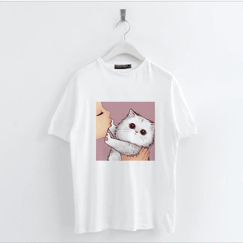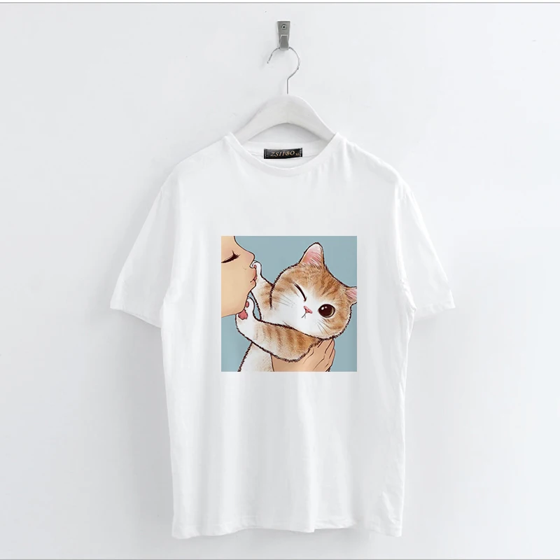 Женская футболка Ulzzang, с забавным мультяшным котом, с коротким рукавом, в японском стиле