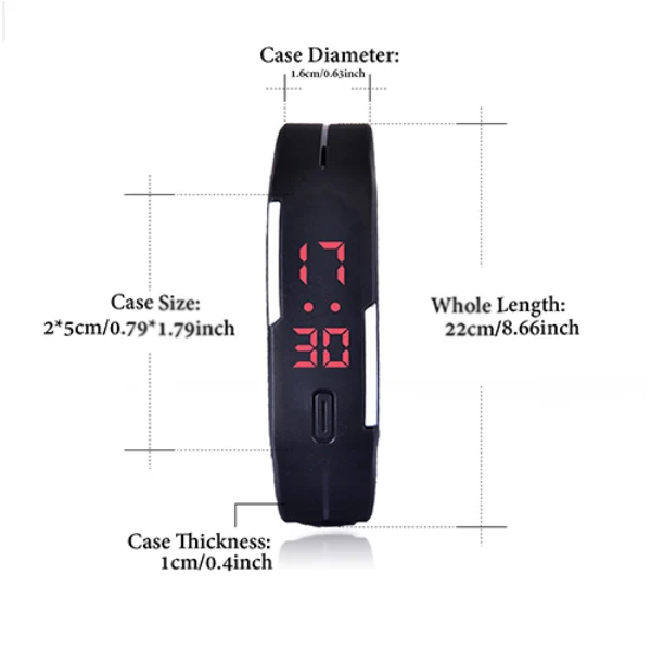 Особенности продукта:Состояние: 100% новыйТип: наручные часыЧерный циферблатСиликоновый ремешок длиной 23 см (Регулируется!)Размер циферблата: 5 centrimetriМатериал циферблата: резиновый силиконМеханизм: кварцевыйБатарея в комплекте!Ширина ремешка: 2 смСтиль:Спортивная повседневная одеждаПол:Унисекс для мужчин и женщинФорма циферблата часов: прямоугольнаяМатериал ремешка: резиновый силиконДлина ремешка: 23 см