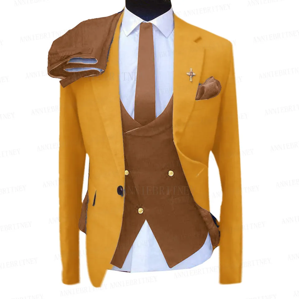 Золотой костюм Для мужчин 3 штуки индивидуальный пошив для жениха свадебное платье смокинг Slim Fit Бизнес пиджак двубортный жилет комплект со штанами