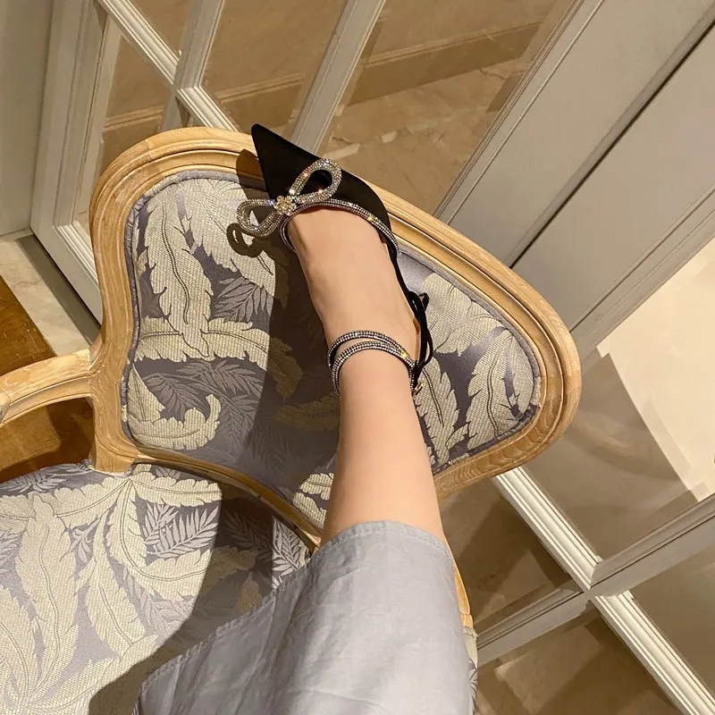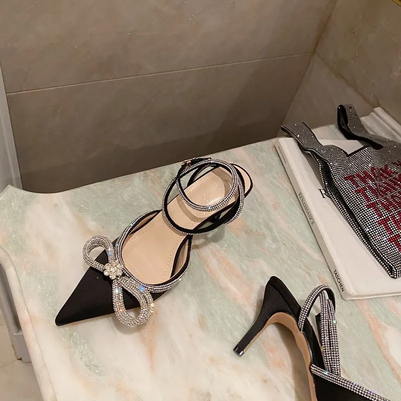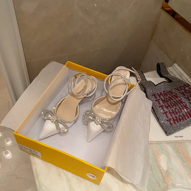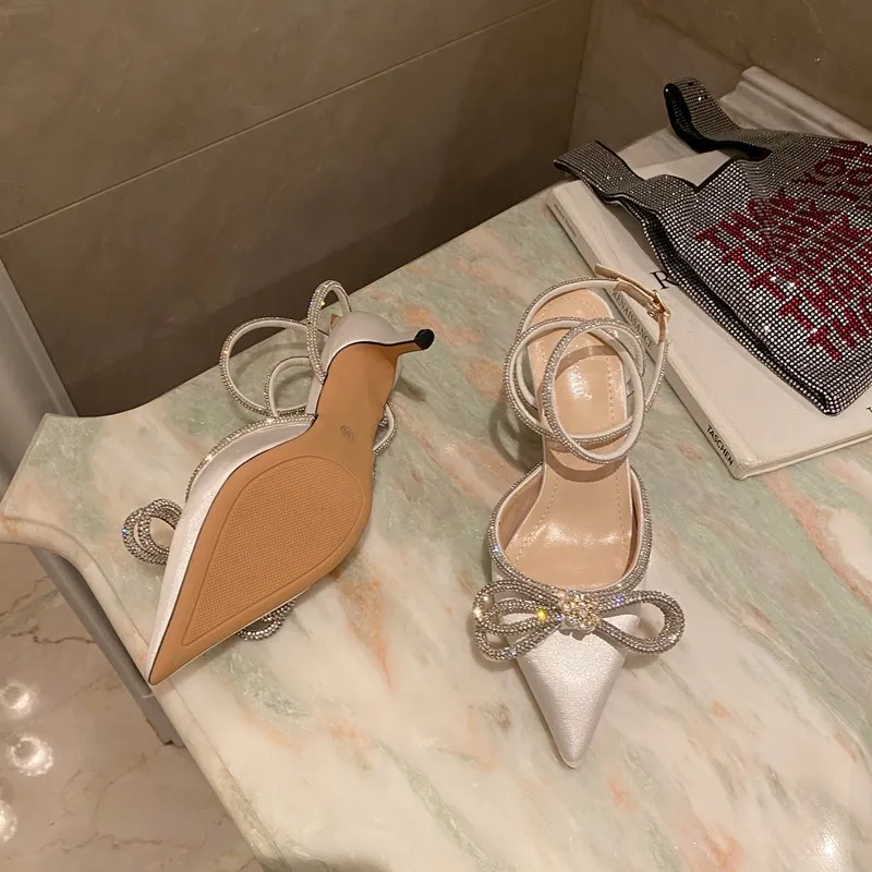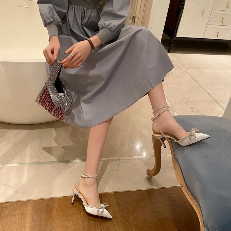 С украшением в виде кристаллов платье-пачка с бантом; Женские сандалии с острым носком дизайнерские туфли на высокой шпильке обувь на каблуке для женщин, с пряжкой; Ремешок; sandalias 2021