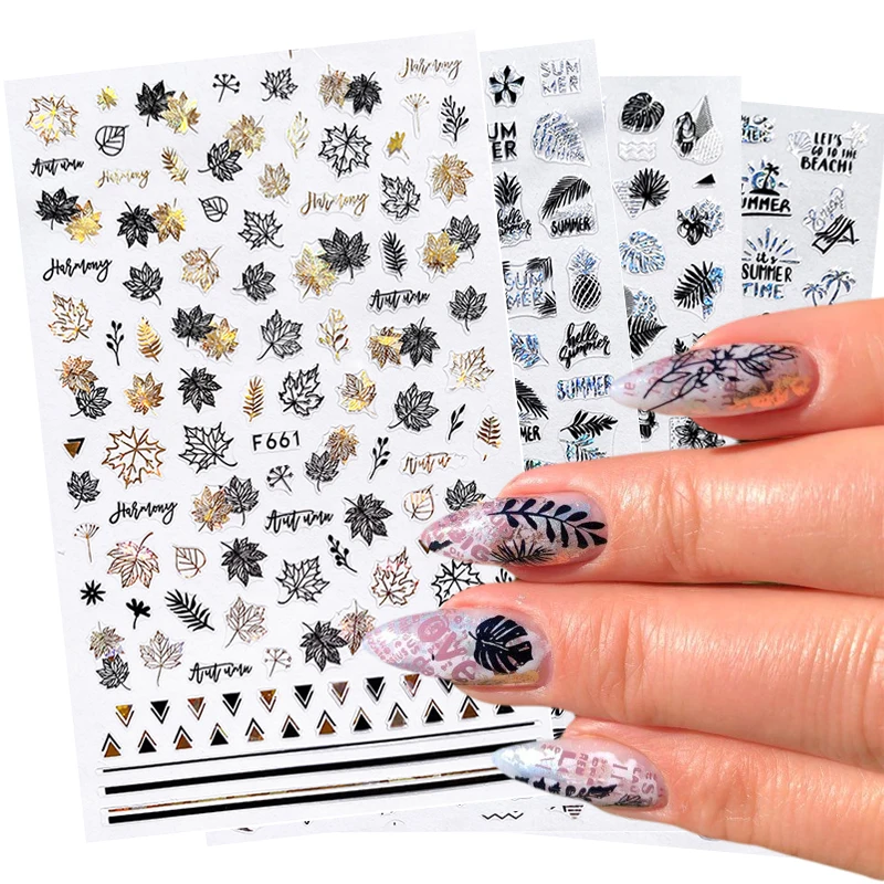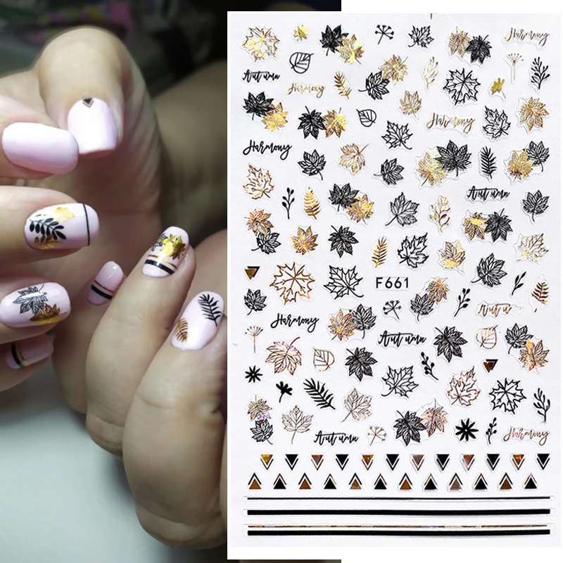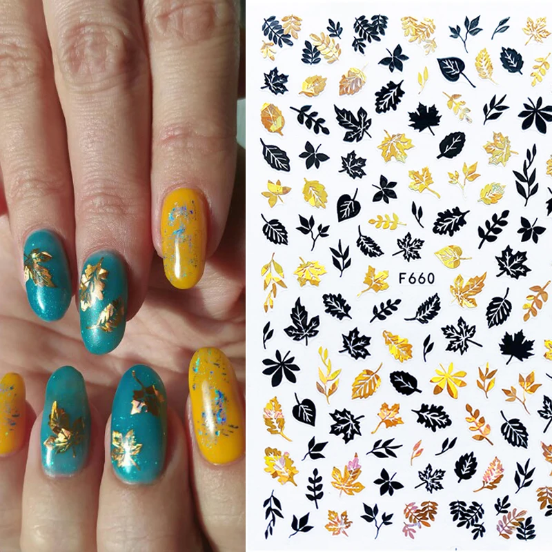 3D наклейка для ногтей с изображением черных и золотых листьев, 1 шт.