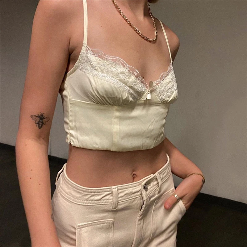 Летний кружевной топ без рукавов Milkmaid с открытой спиной, сексуальный укороченный топ 90s, женская желтая майка на бретельках, модная повседневная Уличная одежда