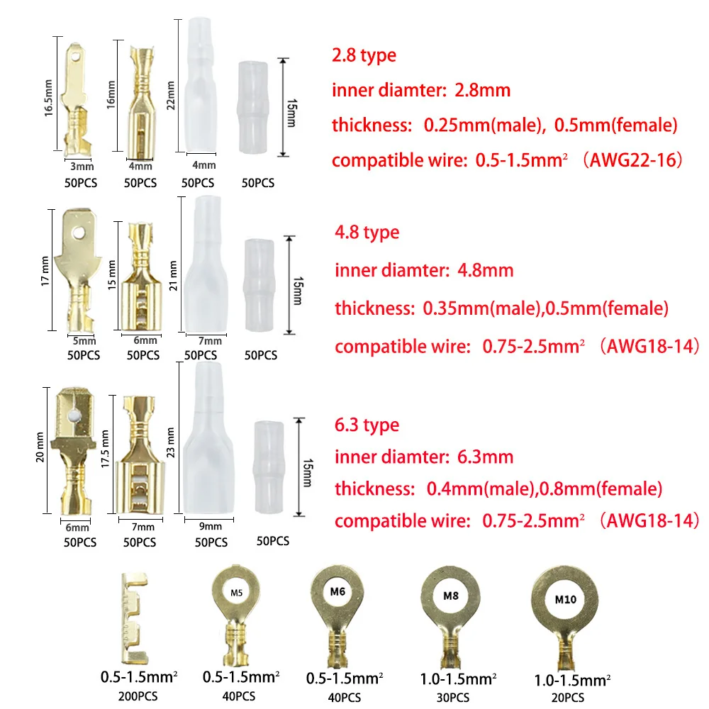 930 шт. обжимные клеммы, женский, мужской, лопатка, изолированный провод, соединительные кольца наконечников, соединитель, неизолированный, набор «сделай сам»