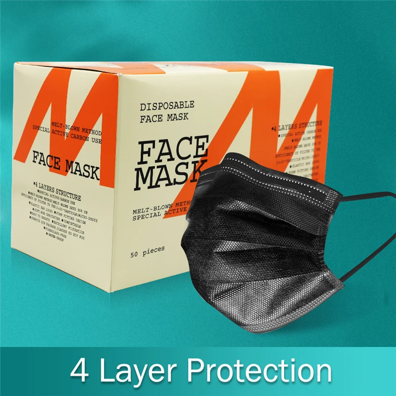 Одноразовая маска с активированным углем, черные маски для взрослых, 4-слойная маска с фильтром и заушными петлями, Нетканая Пылезащитная маска для рта