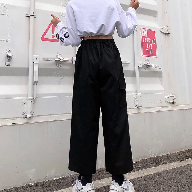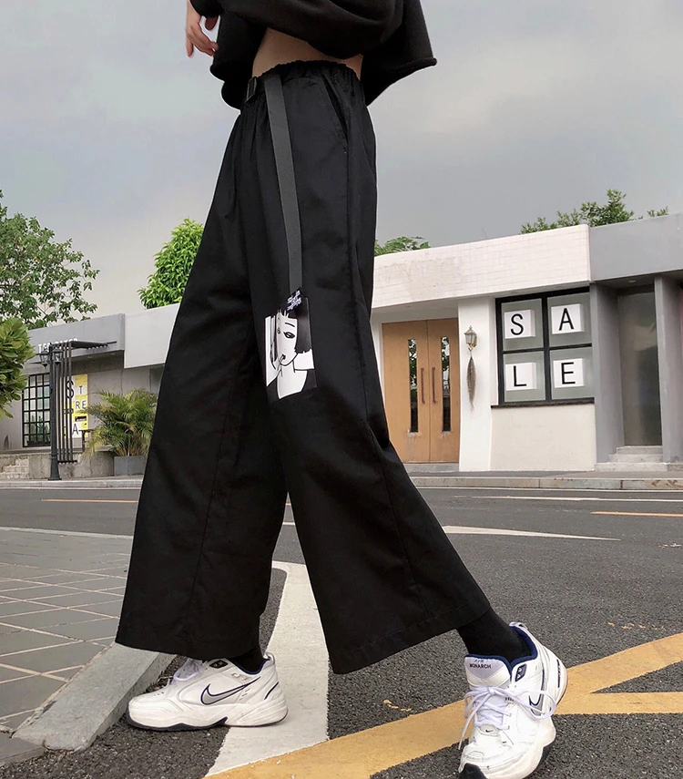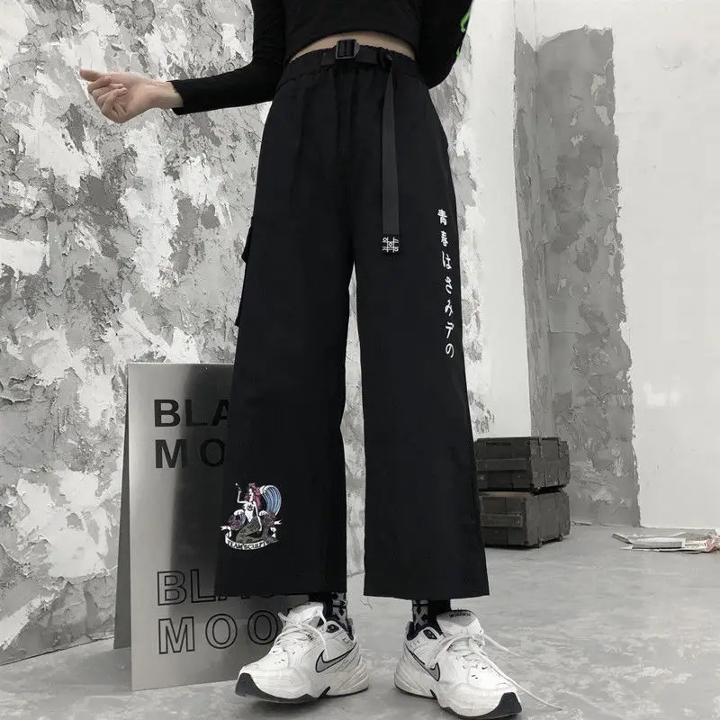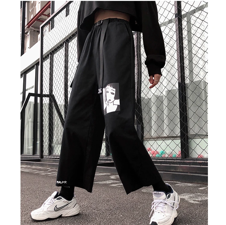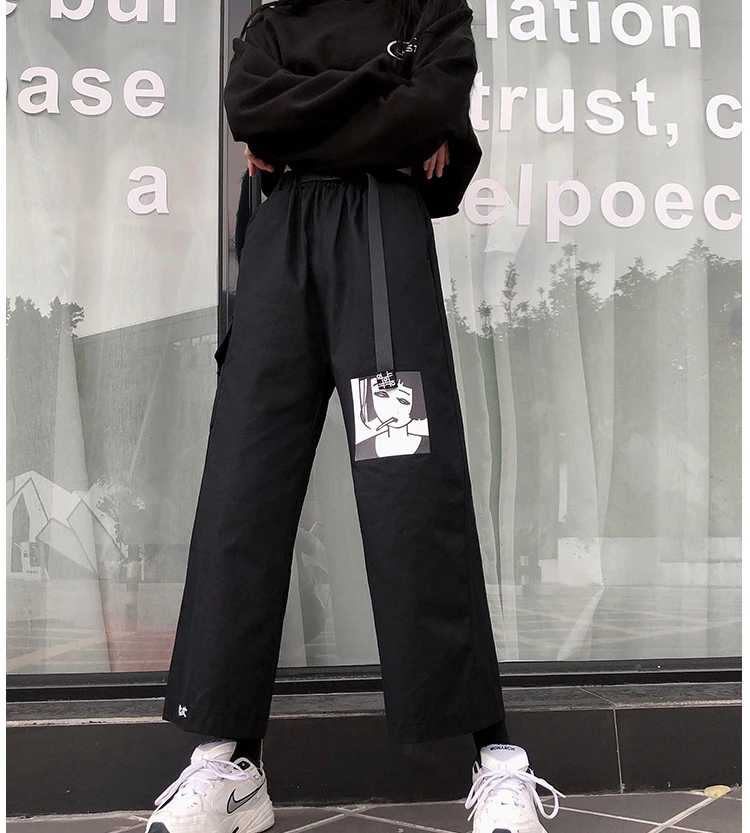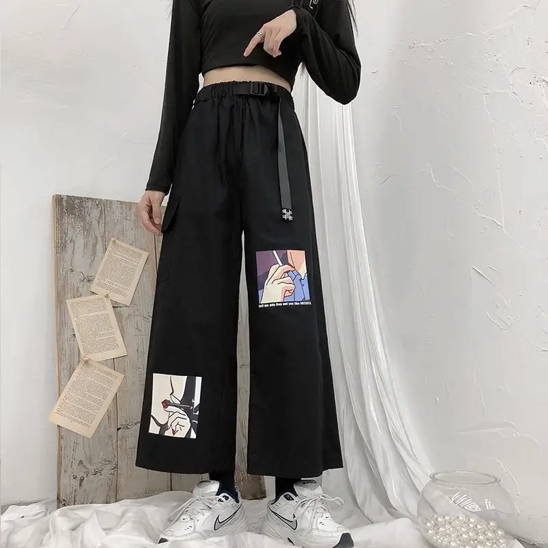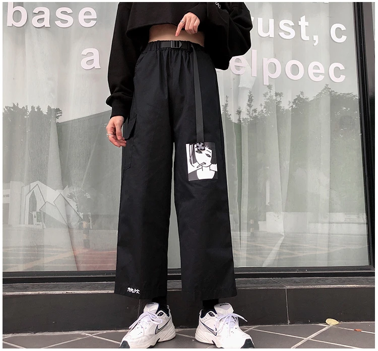 Брюки женские с аниме-принтом, черные, свободные, с высокой талией, с ремнем