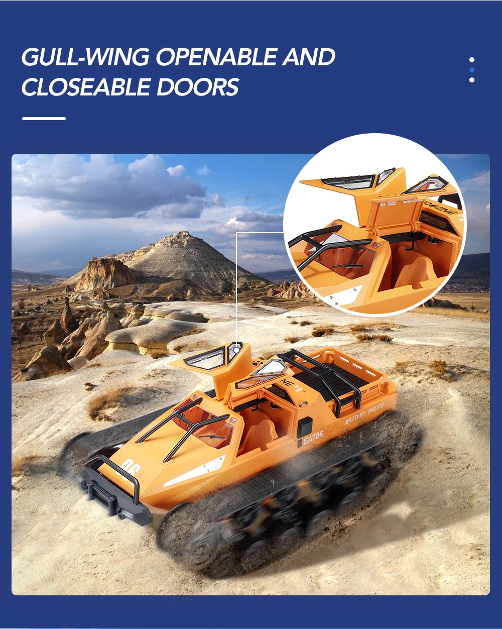 1. Чехол с имитацией двойного привода.2. Литиевая батарея с большим увеличением 1200 мАч3. Полномасштабная синхронная система дистанционного управления 2,4G.4. Вращение на месте 360 °5. Расстояние между траншеями может достигать 10 см.6. Угол подъема 30 °.7. Дверь крыла чайки может быть открыта и закрыта.8. Саморегулируемое крепление переднего колеса.9. Глубина погружения до 5 смПосылка включает в себя:1 * RC автомобиль1 * контроллер1 * аккумуляторная батарея(Встроенный)1 * зарядное устройство