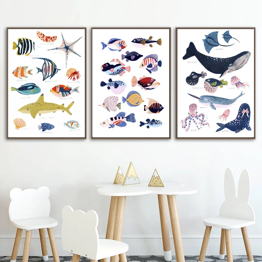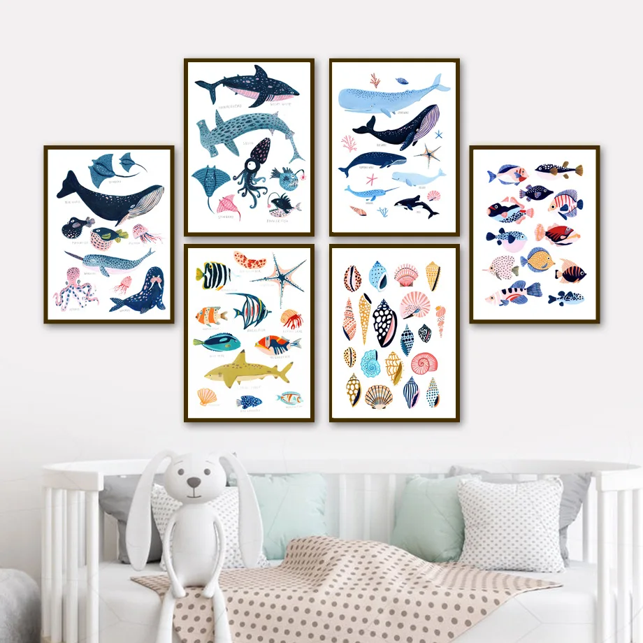 Картина на холсте с изображением морских обитателей, акулы, Кита, раковины, плакаты и принты в скандинавском стиле, настенные картины для декора детской комнаты