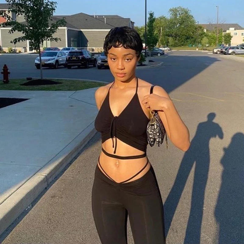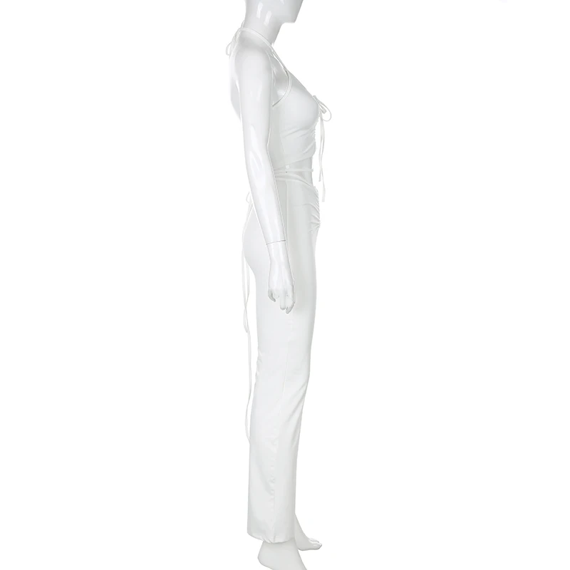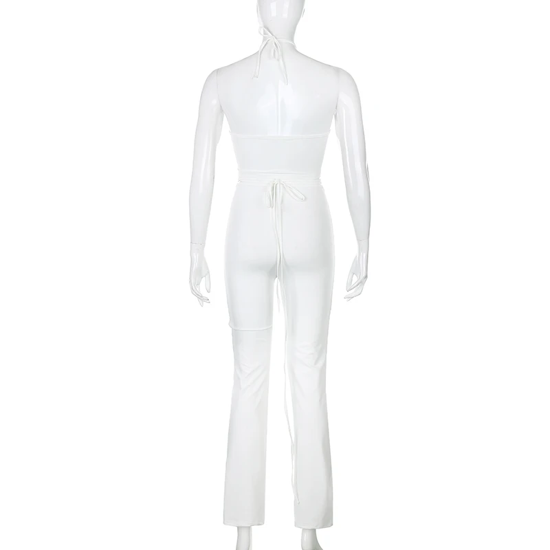 Женский комплект из 2 предметов, сексуальный укороченный топ на бретельках с завязками + расклешенные брюки, уличная одежда