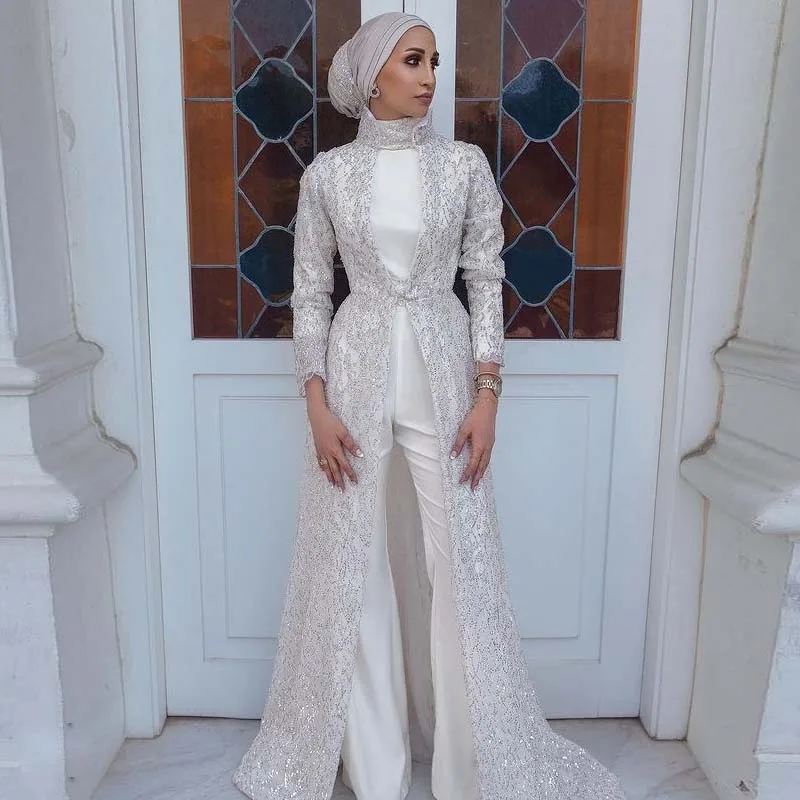 Скромный комбинезон мусульманские Вечерние платья с пальто с высоким воротником с длинными рукавами блесток куртка Дубай Абаи платье-кафтан