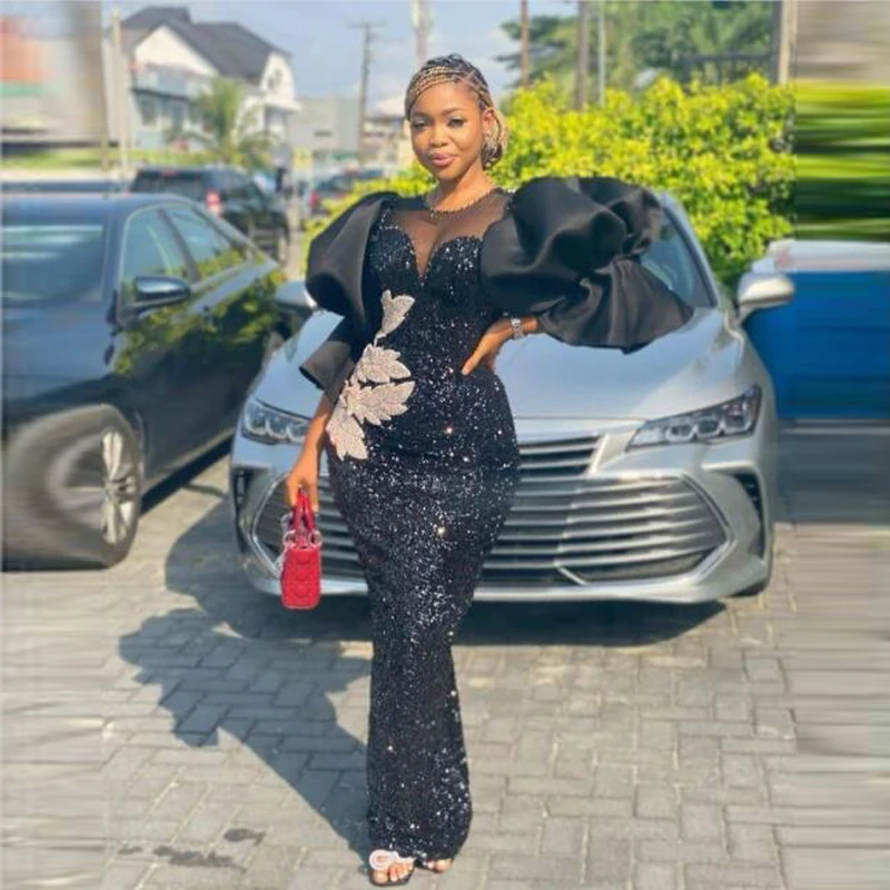 Черное платье-Русалка для выпускного вечера с пышным вырезом, с блестками, длинными рукавами, 34, вечерние наряды в африканском стиле для вечеринки, размера плюс