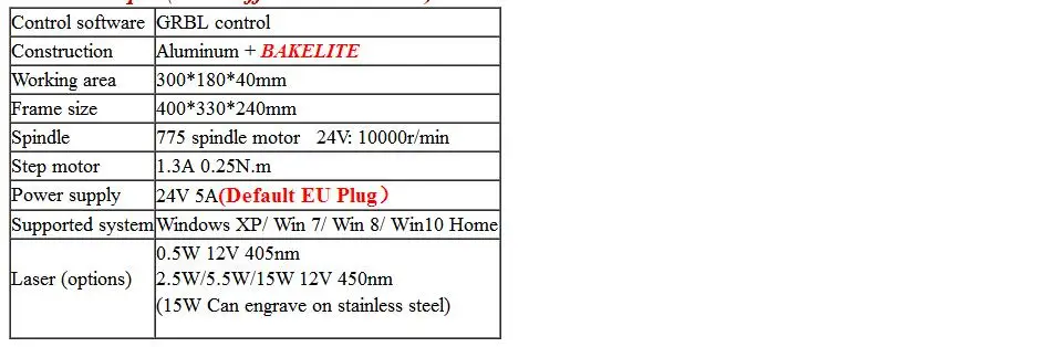 3018pro: Упаковка 1: 1 гравировальный станок + 1 ER11 + 10 резаков + 4 пластины + 1 U-диск 4G Упаковка 2: 1 гравировальный станок + 1 ER11 + 10 резаков + 4 пластины + лазер 500 МВт + 1 U-диск 4G Упаковка 3: 1 гравировальный станок + 1 ER11 + 10 резаков + 4 пластины + лазер 2500 мвт + 1 U-диск 4G Упаковка 4: 1 гравировальный станок + 1 ER11 + 10 резаков + 4 пластины + лазер 5500 МВт + 1 U-диск 4G Упаковка 5: 1 гравировальный станок + 1 ER11 + 10 резаков + 4 пластины + лазер 15000 МВт + 1 U-диск 4G 3018pro офлайн: Упаковка 1.1 гравировальный станок + 1 ER11 + 10 резаков + 4 пластины + 1 автономное управление + 1 U-диск 4G Упаковка 2.2 1 гравировальный станок + 1 ER11 + 10 резаков + 4 пластины + 500 МВт лазер + 1 автономное управление + 1 U-диск 4G Упаковка 2500 1 гравировальный станок + 1 ER11 + 10 резаков + 4 пластины + лазер МВт + 1 автономное управление + 1 U-диск 4G Package4.2 1 гравировальный станок + 1 ER11 + 10 резаков + 4 пластины + 5500 МВт лазер + 1 автономное управление + 1x4G U диск Упаковка 15000 1 гравировальный станок + 1 ER11 + 10 резаков + 4 пластины + лазер МВт + 1 автономное управление + 1 U-диск 4G Дружеское напоминание: Мы предлагаем вам сделать видео распаковки по получении этого аппарата. Просто в чехол you Если вы получили дефектную или поврежденную деталь, пожалуйста, свяжитесь с нами для замены.