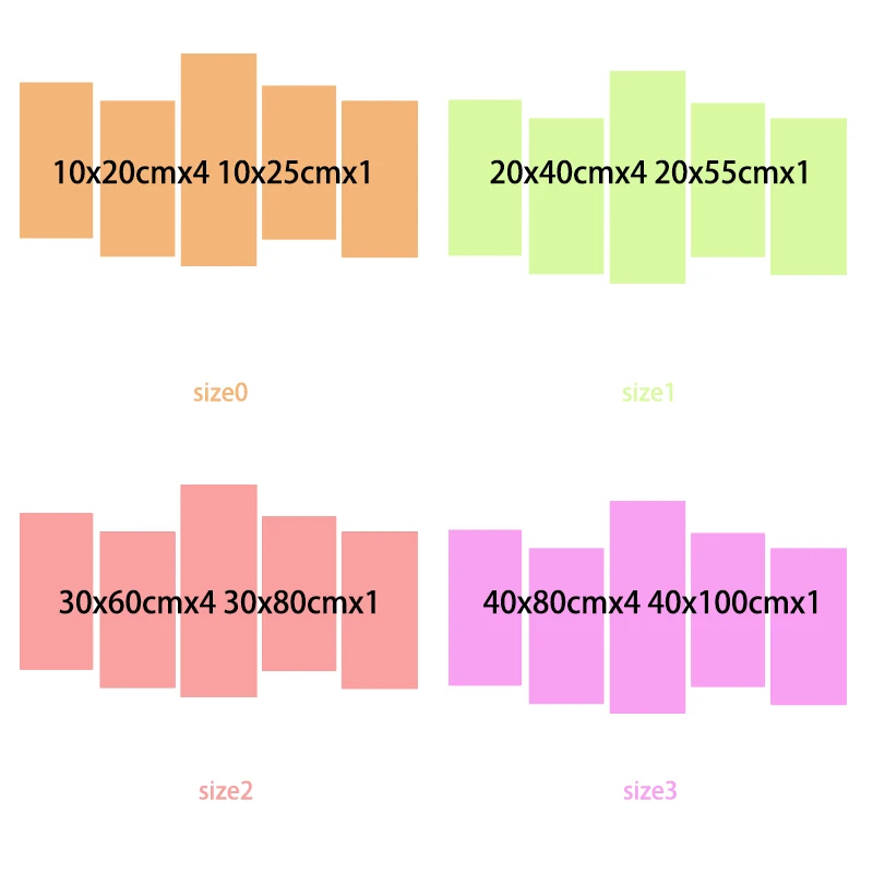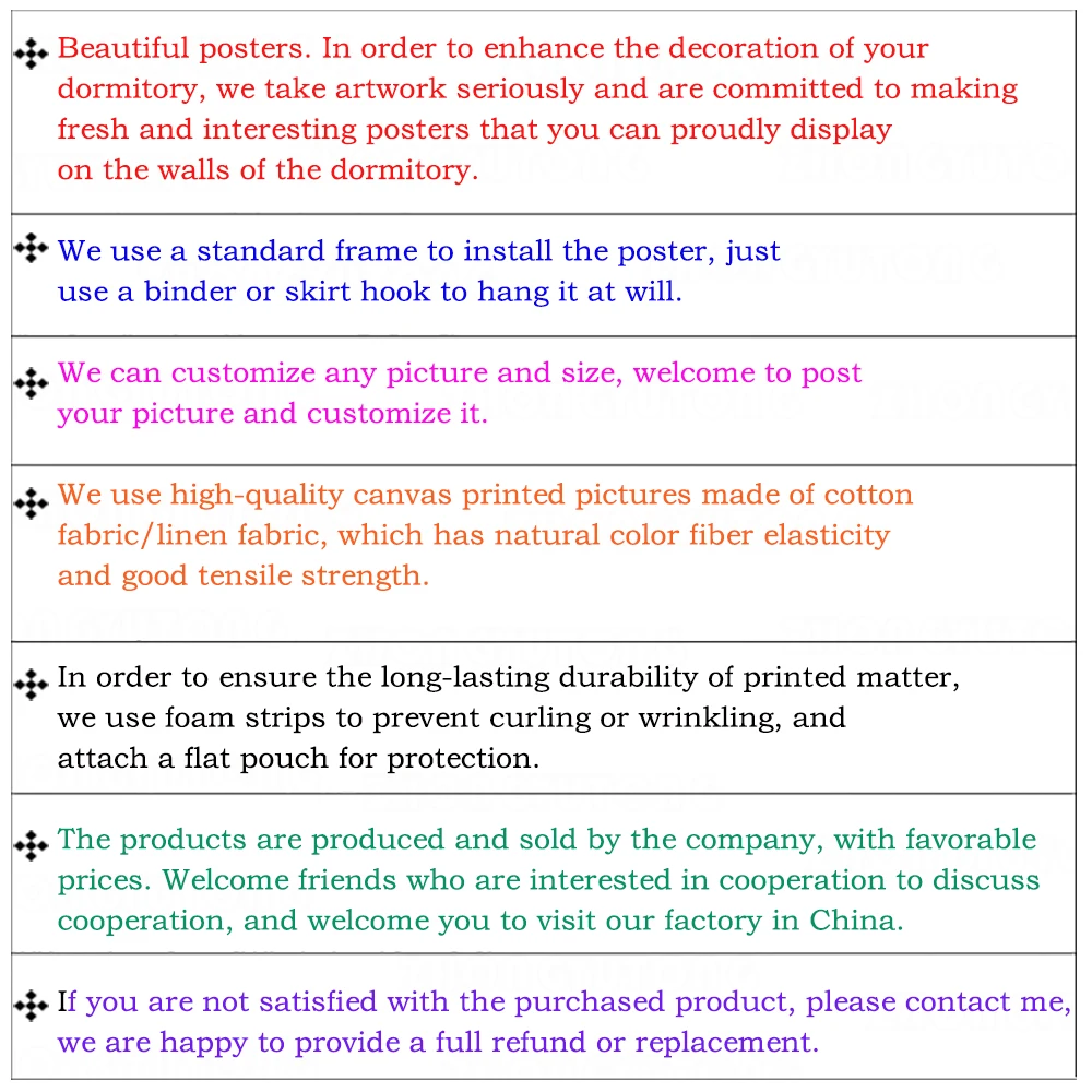 * Размер 0: 10x20 см x 10x25 см x 1 Размер 1: 20x40 см x 4 20x55 см x 1 Размер 2: 30x60 см x 4 30x80 см x 1 Размер 3: 40x80 см x 40x100 см x 1 * Изготовлен из хлопковой ткани, водонепроницаемый, прочный, с высококачественными принтами, 5 картин на холсте. * Мы можем настроить любое изображение и размер, будем рады отправить ваше изображение для настройки. * Мы профессиональная фабрика по масляной живописи, мы можем доставить вам товары и рады долгосрочному сотрудничеству. * После размещения заказа ожидается Отправка товара в течение 24 часов, и ожидается, что он прибудет в пункт назначения в течение 15-45 дней. * Изображение монитора может отличаться от фактического продукта, пожалуйста, Знакомьтесь с ним.