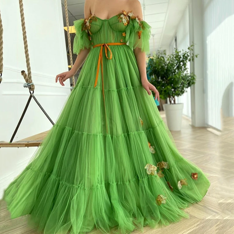 UZN элегантное зелёное платье с открытыми плечами Тюль платье для выпускного вечера Новое поступление трапециевидной формы Рубашка с короткими рукавами с цветочным принтом вечернее платье размера плюс Плиссированные Длинные вечерние платья
