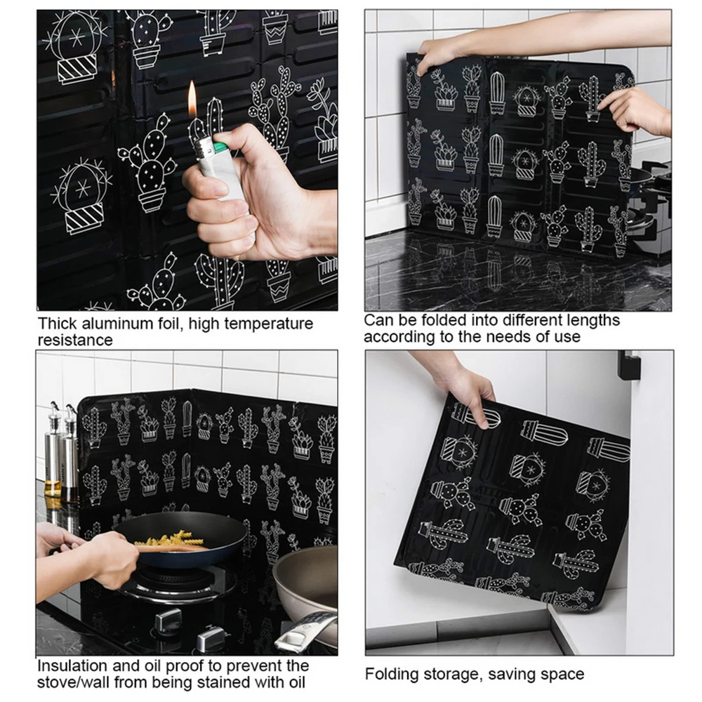 Особенности1. Использование: три откидные панели разворачиваются и окружают ваши сковороды и сковороды, обеспечивая высокий защитный барьер от горячего и вредного жира.2. Антипригарная поверхность: легко чистится, что делает кухню более аккуратной.3. Легко хранить: можно сложить до разных размеров для удобного использования и хранения, не занимает много места. Простота использования: Просто поместите щит на сковороду во время готовки. Легко моется, вы можете использовать чистящую салфетку или бумагу для очистки грязи.4. Подходит для любой горелки-три откидные панели, которые можно отрегулировать для любой горелки или сковороды.5. Материал: изготовлен из алюминиевой фольги, маслостойкий, водонепроницаемый, прочный для длительного использования. Термостойкость: Изготовлен из алюминиевой фольги, температура плавления достигает 660 градусов, термостойкий и прочный.ПараметрыМатериал: фольгаЦвет: черный, белыйРазмер: 84,5x32,5x0,08 смПосылка входит:1 масляная перегородка