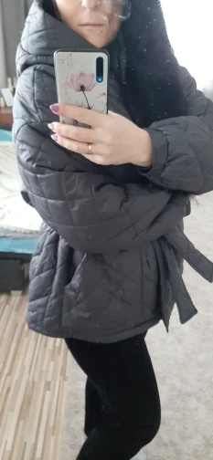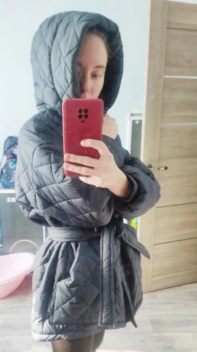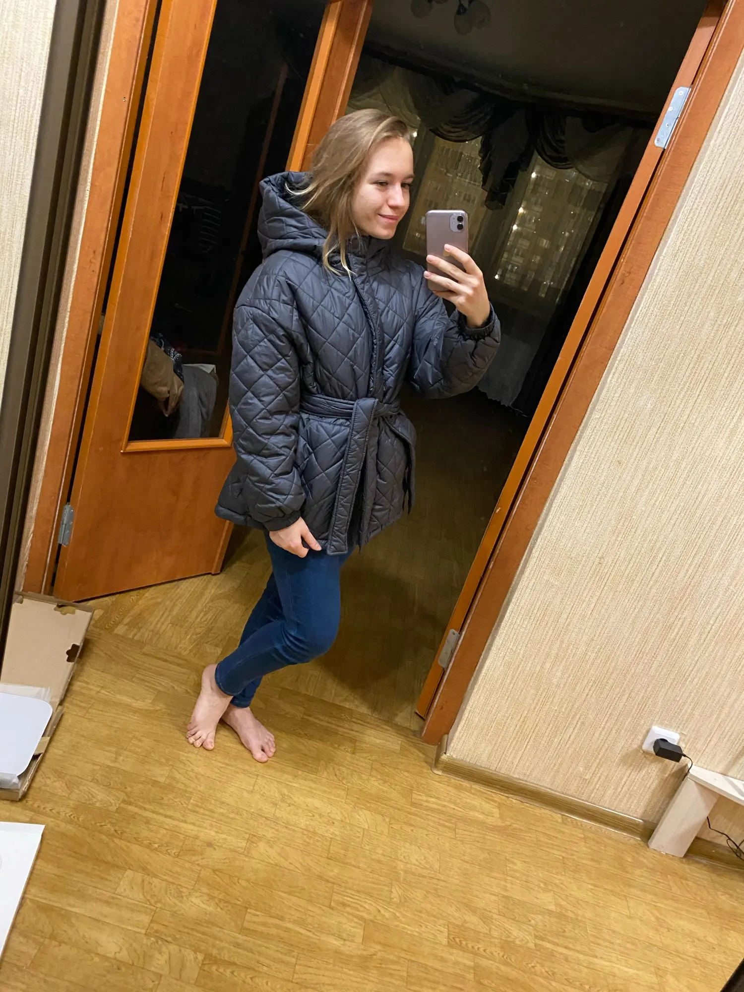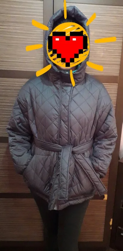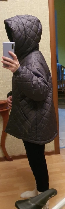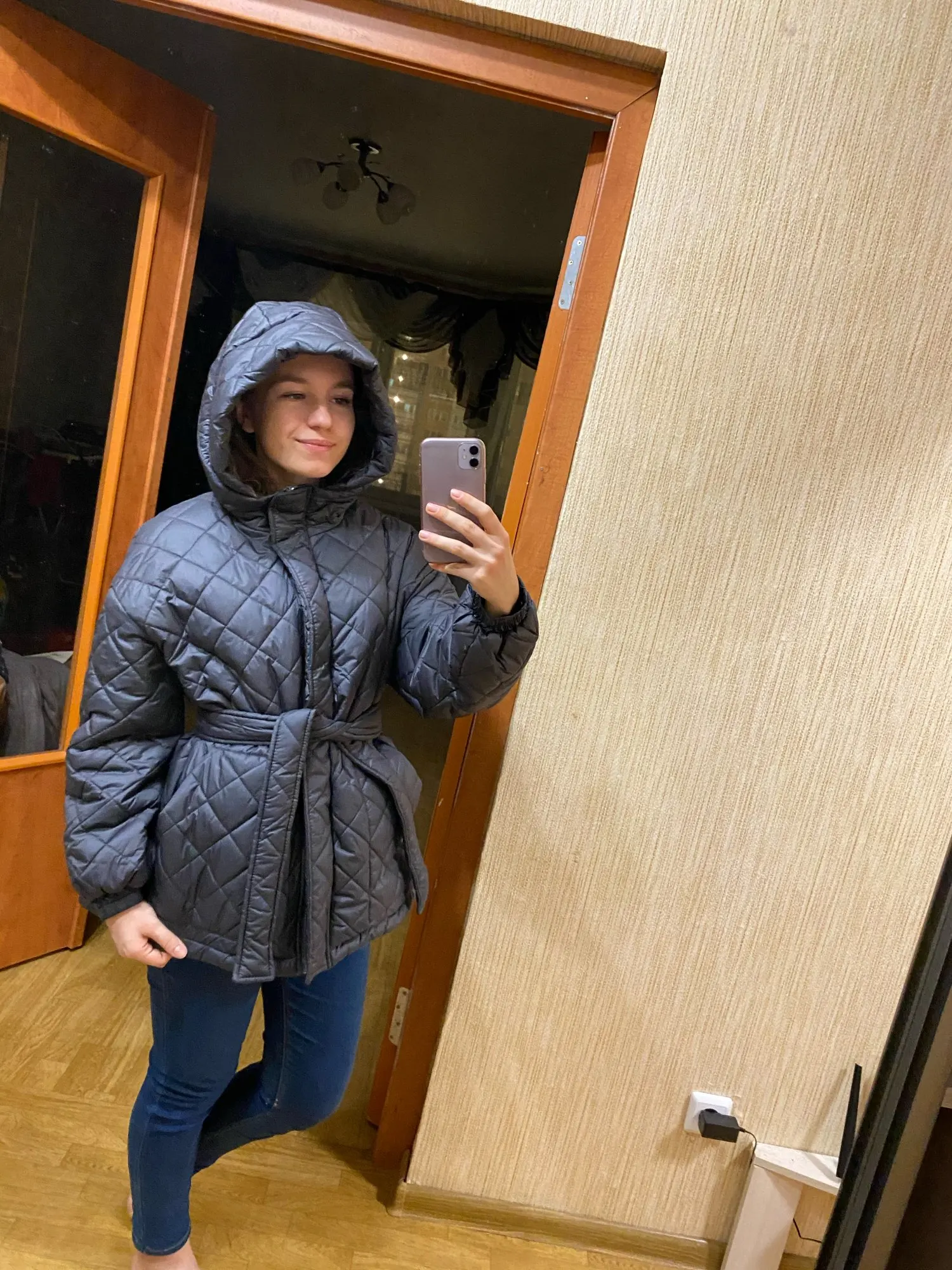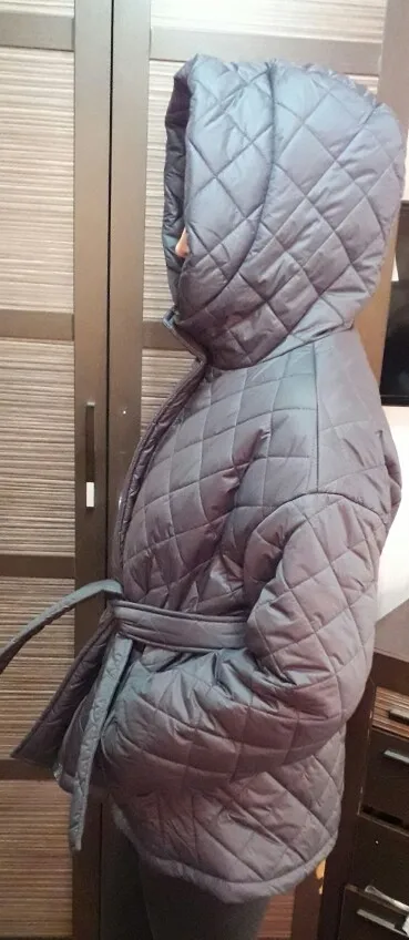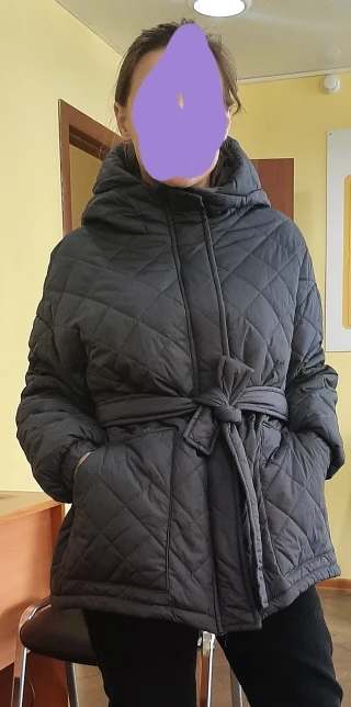 Тонкая курточка на синтепоне, цвет мокрый асфальт, достаточно широкая, на мои параметры 93/76/100 - Sка сидит даже как небольшой оверсайз, рост 163- рукава как раз, на девочек выше,будут уже короткие. Нет ни пуговиц ни кнопок на запахе молнии, то есть без пояса смотреться будет так себе,будет топорщится этот запах. Сшито качественно, нитки не торчат,швы ровные!Продавец хороший!