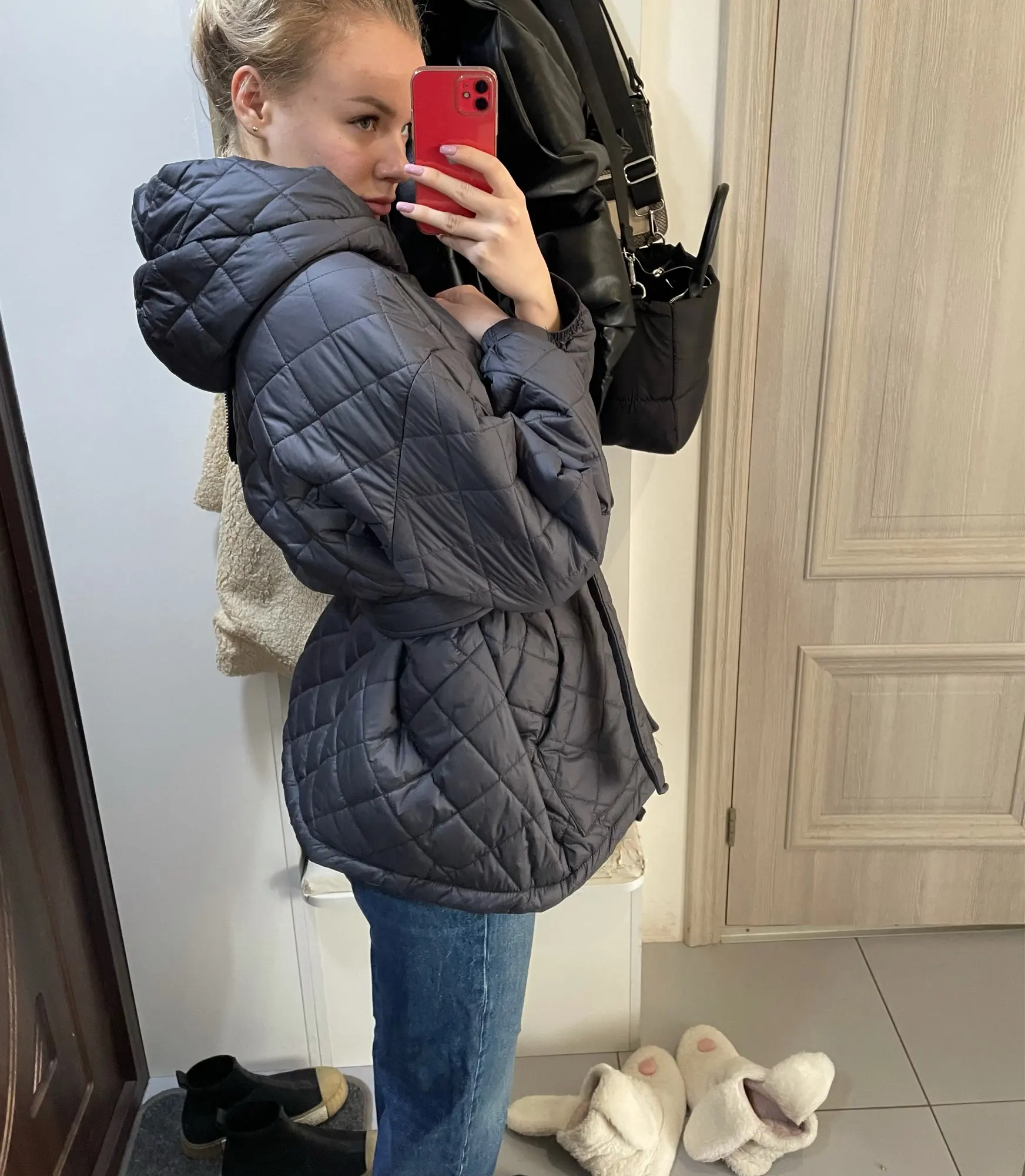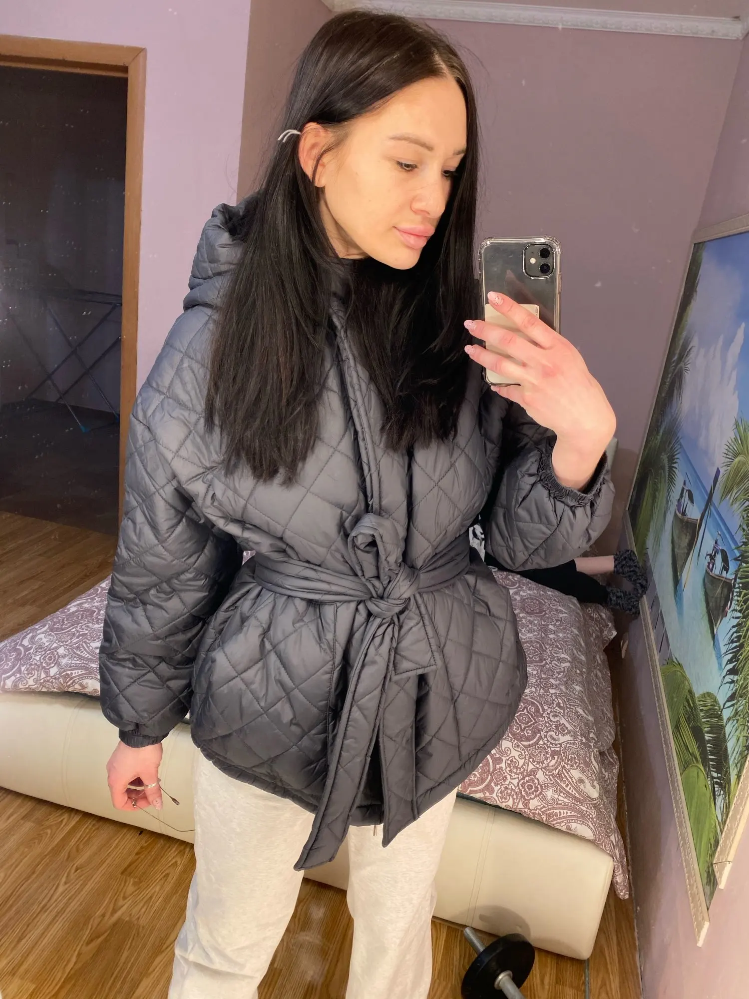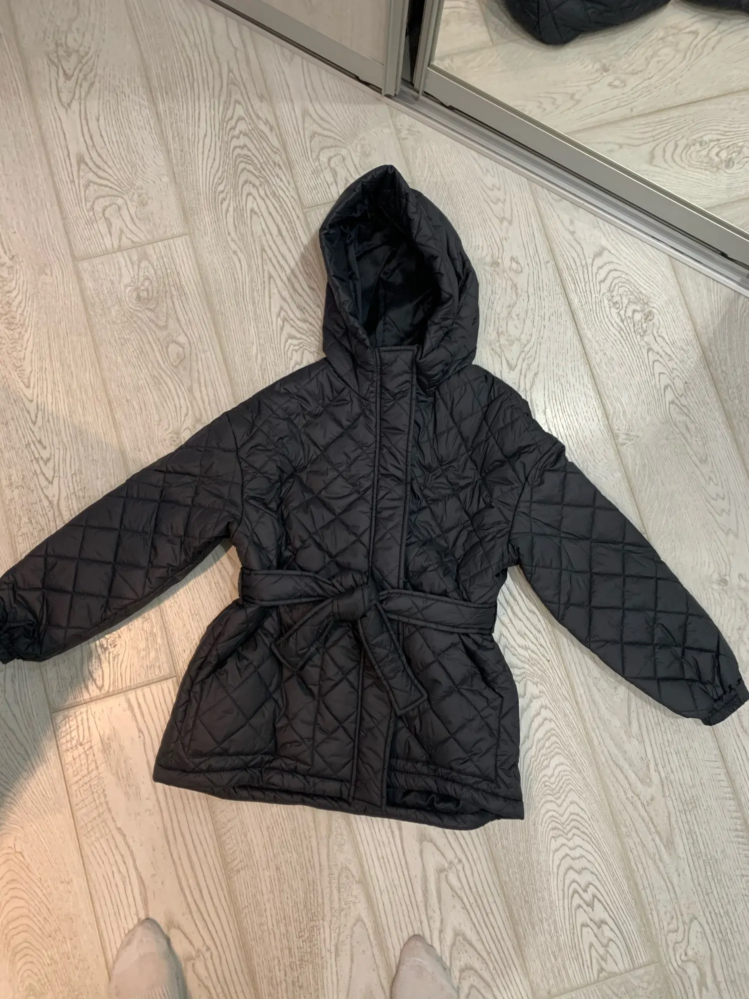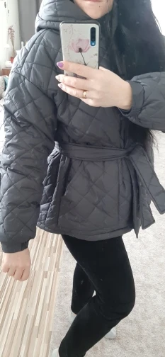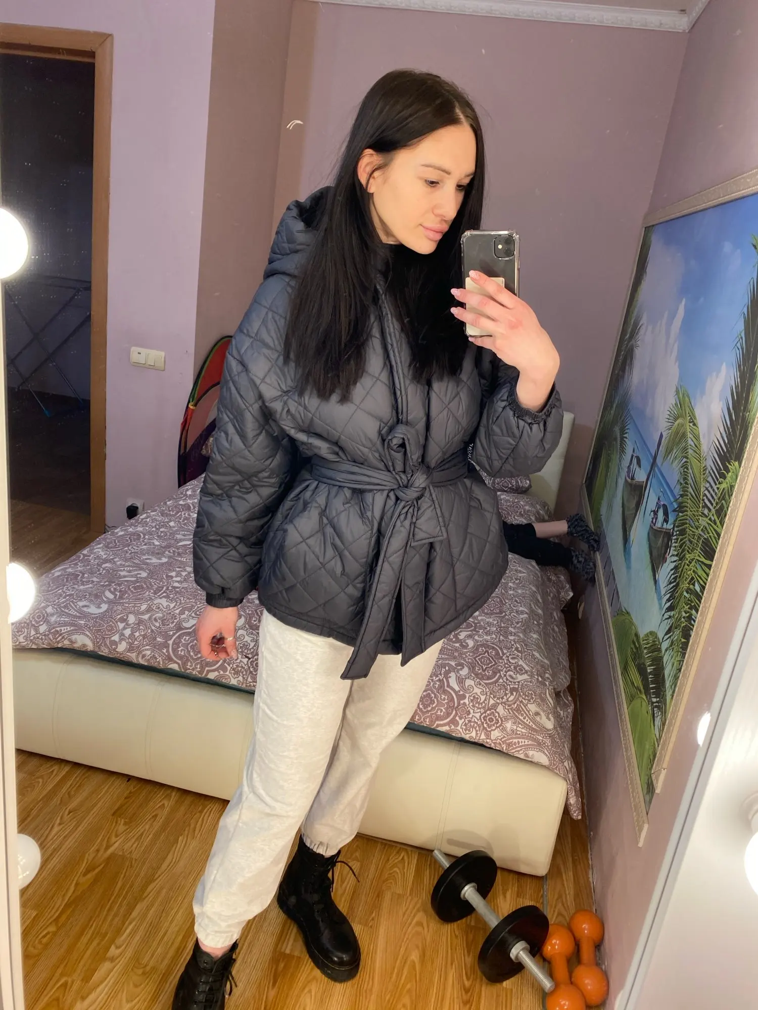Тонкая курточка на синтепоне, цвет мокрый асфальт, достаточно широкая, на мои параметры 93/76/100 - Sка сидит даже как небольшой оверсайз, рост 163- рукава как раз, на девочек выше,будут уже короткие. Нет ни пуговиц ни кнопок на запахе молнии, то есть без пояса смотреться будет так себе,будет топорщится этот запах. Сшито качественно, нитки не торчат,швы ровные!Продавец хороший!